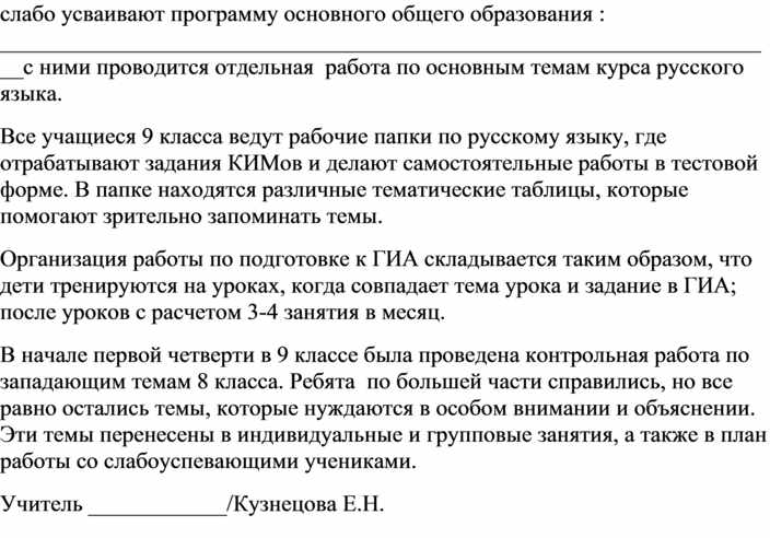 В начале первой четверти в 9 классе была проведена контрольная работа по западающим темам 8 класса. Ребята по большей части справились, но все равно остались темы, которые нуждаются в особом внимании и объяснении. Эти темы перенесены в индивидуальные и групповые занятия, а также в план работы со слабоуспевающими учениками.