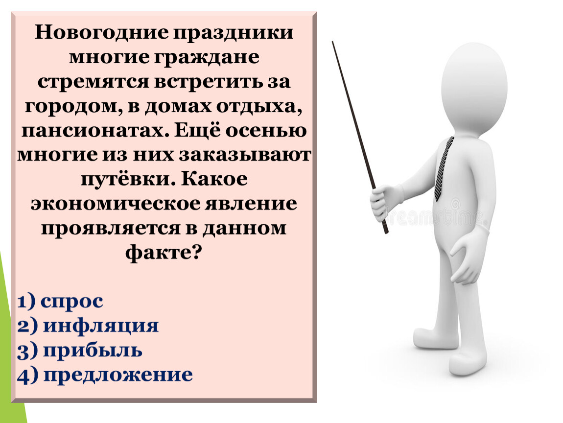 Новогодние праздники многие граждане стремятся встретить за городом, в домах отдыха, пансионатах. Ещё осенью многие из них заказывают путёвки. Какое экономическое явление проявляется в данном факте?
