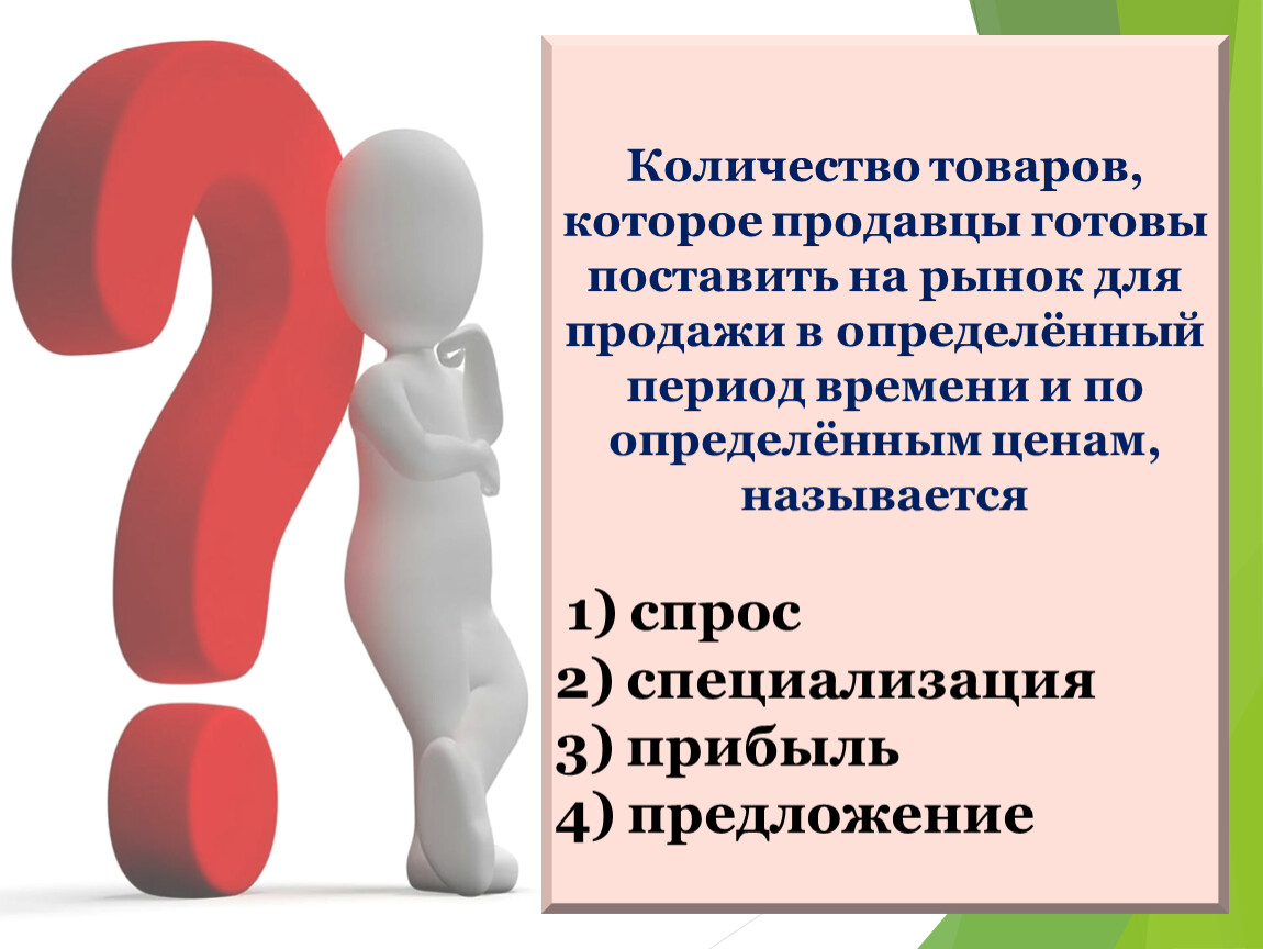 Количество товаров, которое продавцы готовы поставить на рынок для продажи в определённый период времени и по определённым ценам, называется