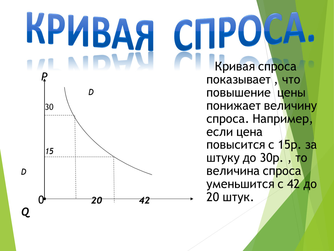 Кривая спроса показывает , что повышение цены понижает величину спроса. Например, если цена повысится с 15р. за штуку до 30р. , то величина спроса уменьшится с 42 до 20 штук.
