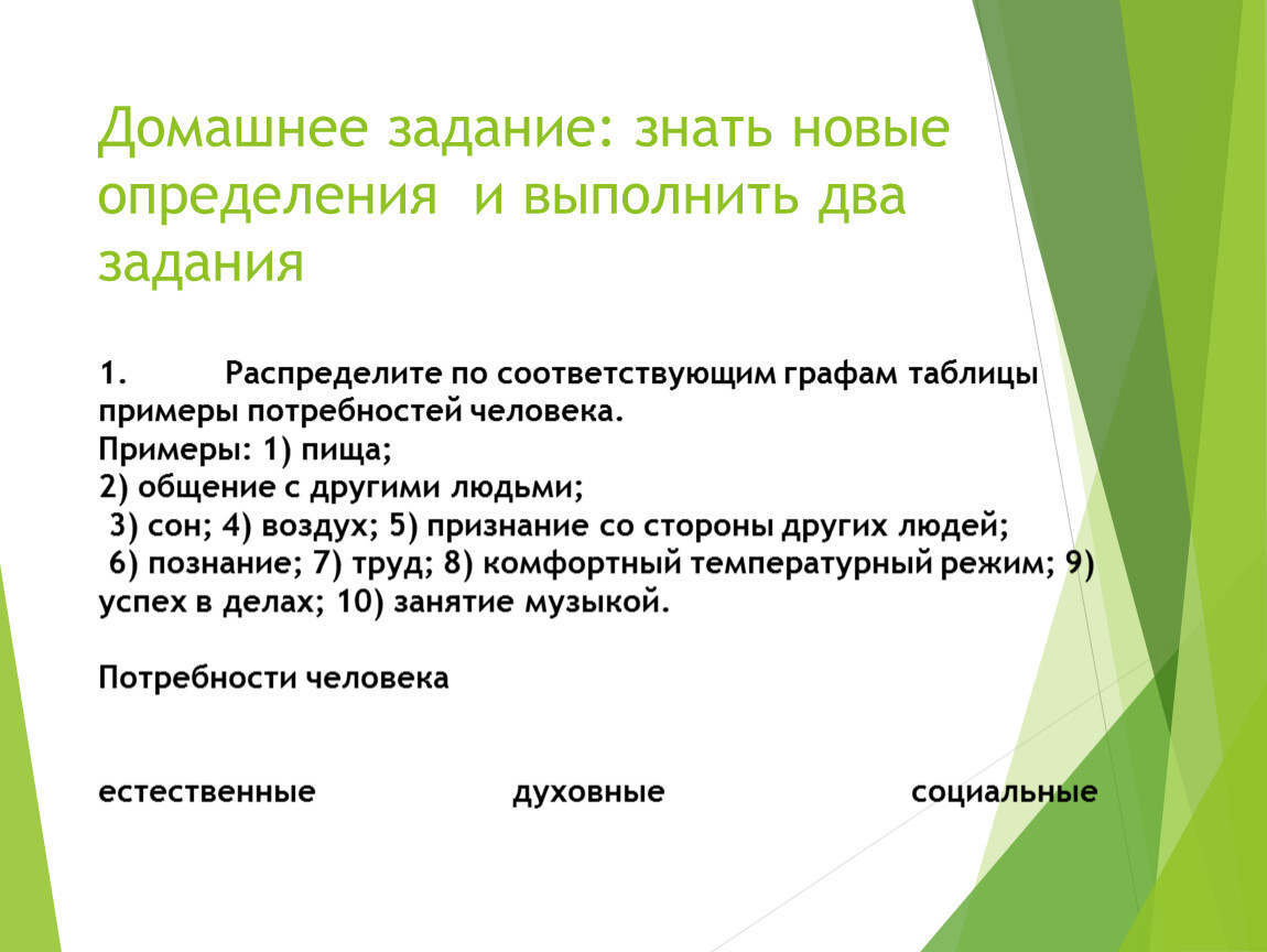 1. Распределите по соответствующим графам таблицы примеры потребностей человека.