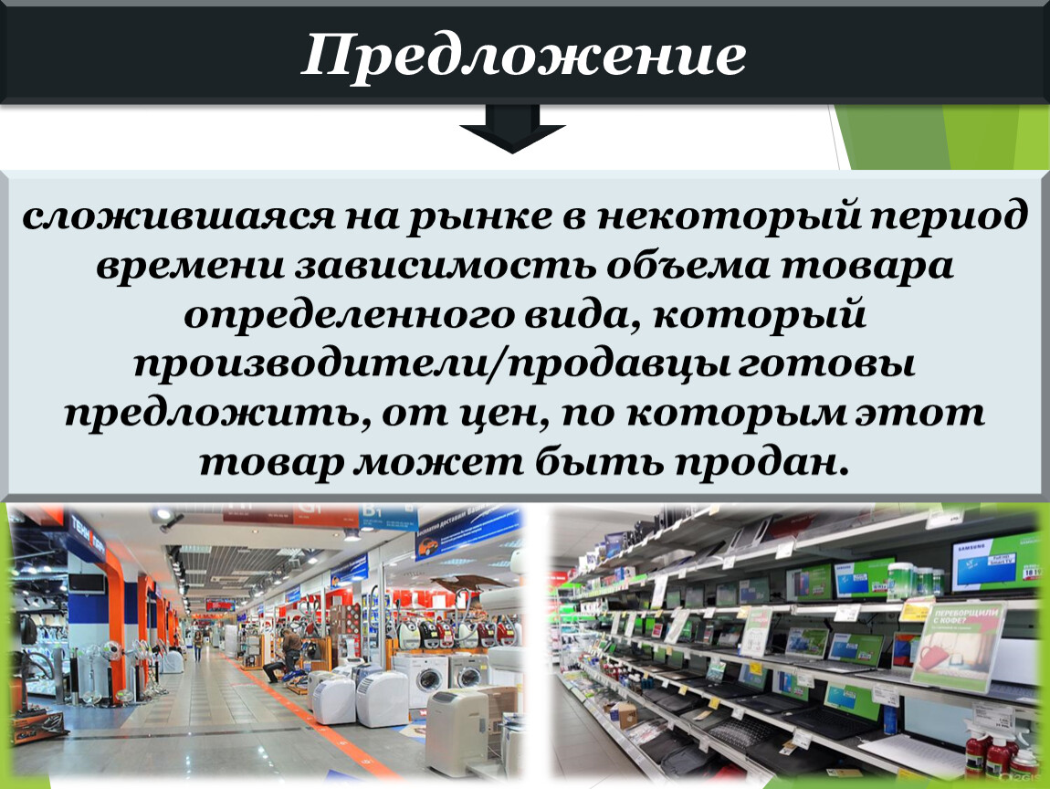 сложившаяся на рынке в некоторый период времени зависимость объема товара определенного вида, который производители/продавцы готовы предложить, от цен, по которым этот товар может быть продан.