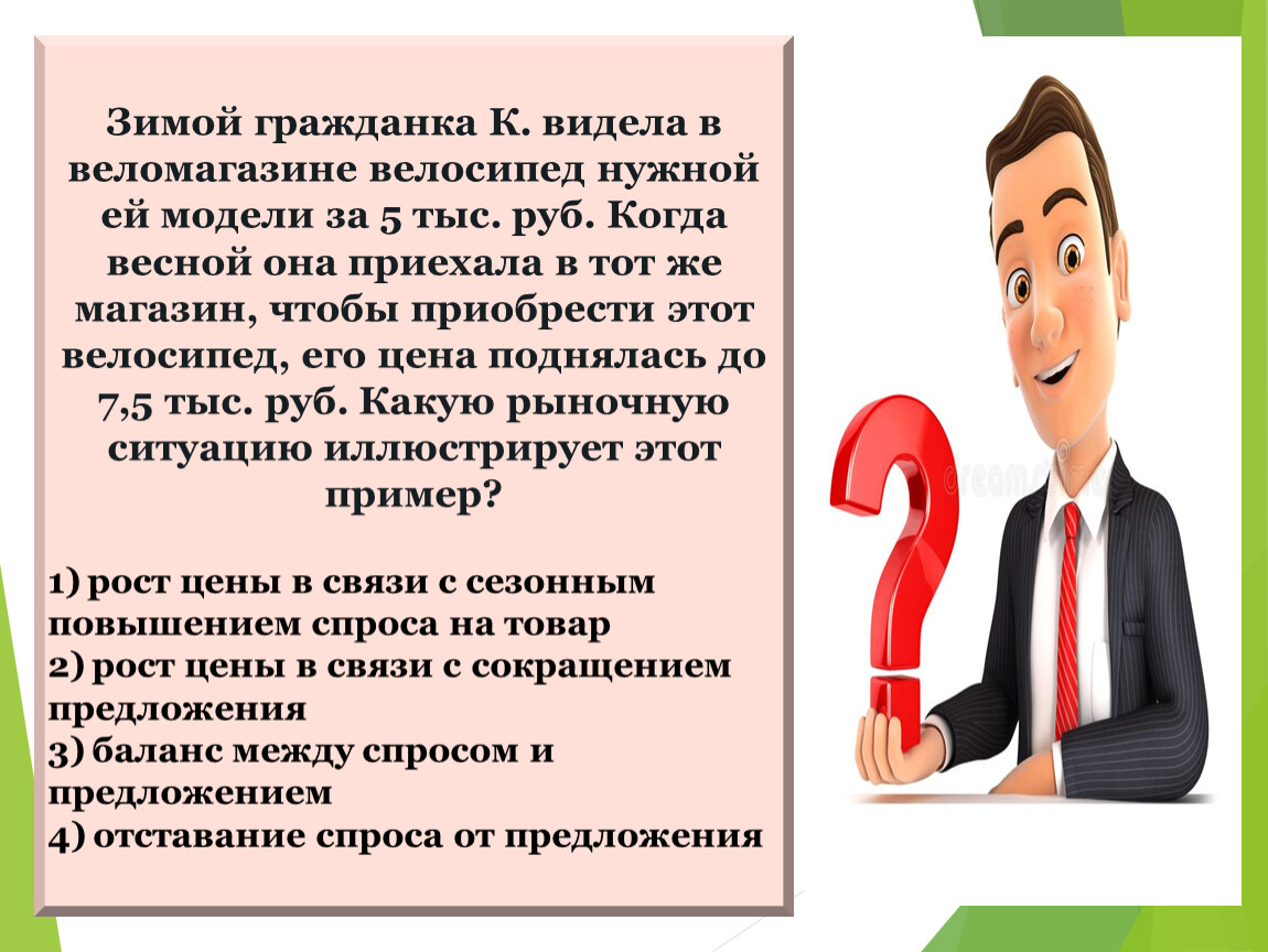Зимой гражданка К. видела в веломагазине велосипед нужной ей модели за 5 тыс. руб. Когда весной она приехала в тот же магазин, чтобы приобрести этот велосипед, его цена поднялась до 7,5 тыс. руб. Какую рыночную ситуацию иллюстрирует этот пример?