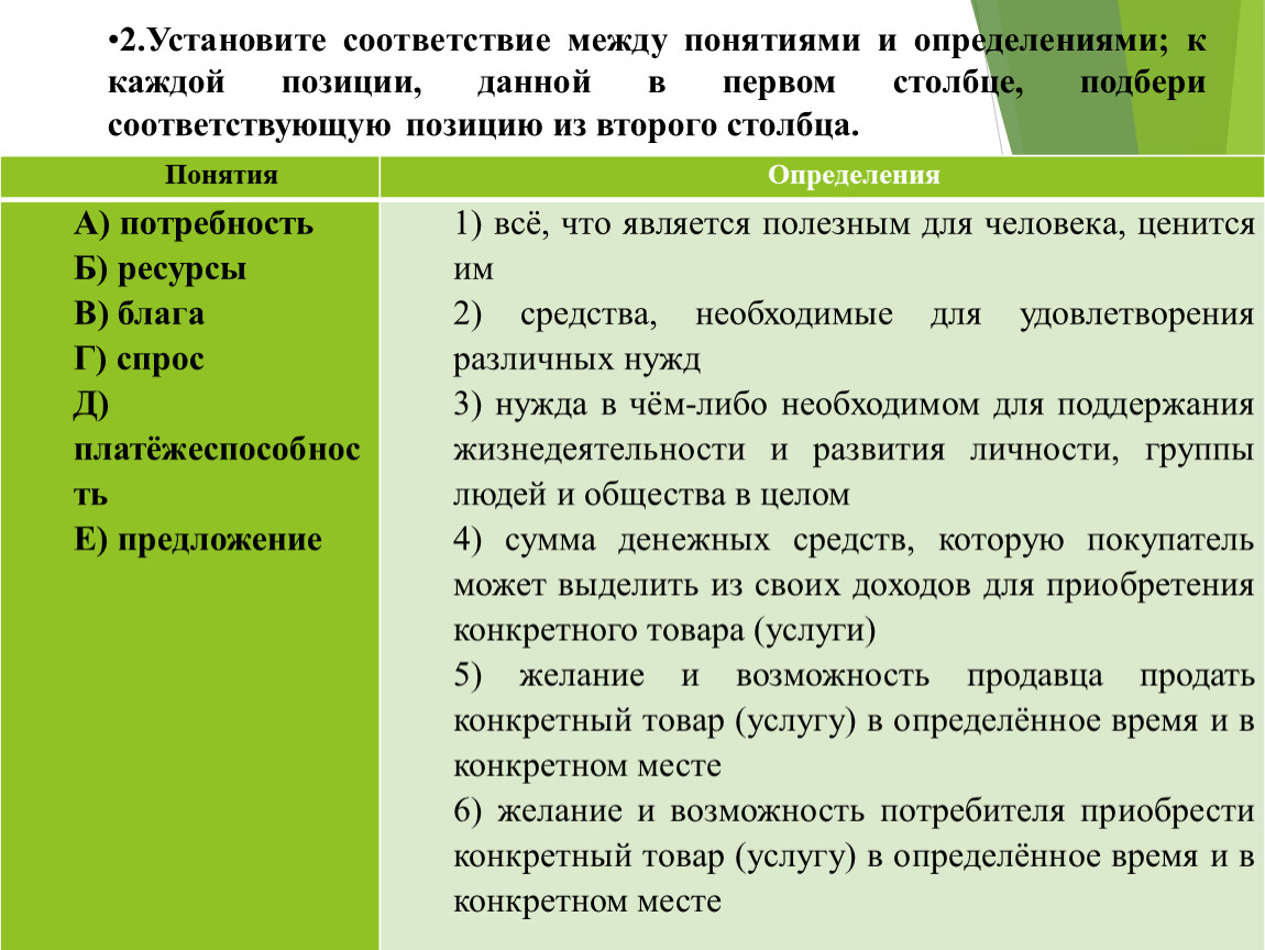 2.Установите соответствие между понятиями и определениями; к каждой позиции, данной в первом столбце, подбери соответствующую позицию из второго столбца.