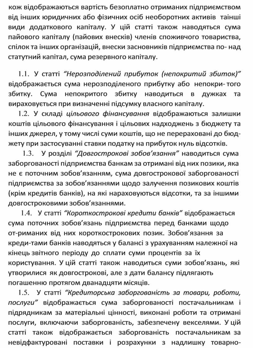 1.8. У статті “Нерозподілений прибуток (непокритий збиток)” відображається сума нерозподіленого прибутку або непокри- того збитку. Сума непокритого збитку наводиться в дужках та вираховується при визначенні підсумку власного капіталу.