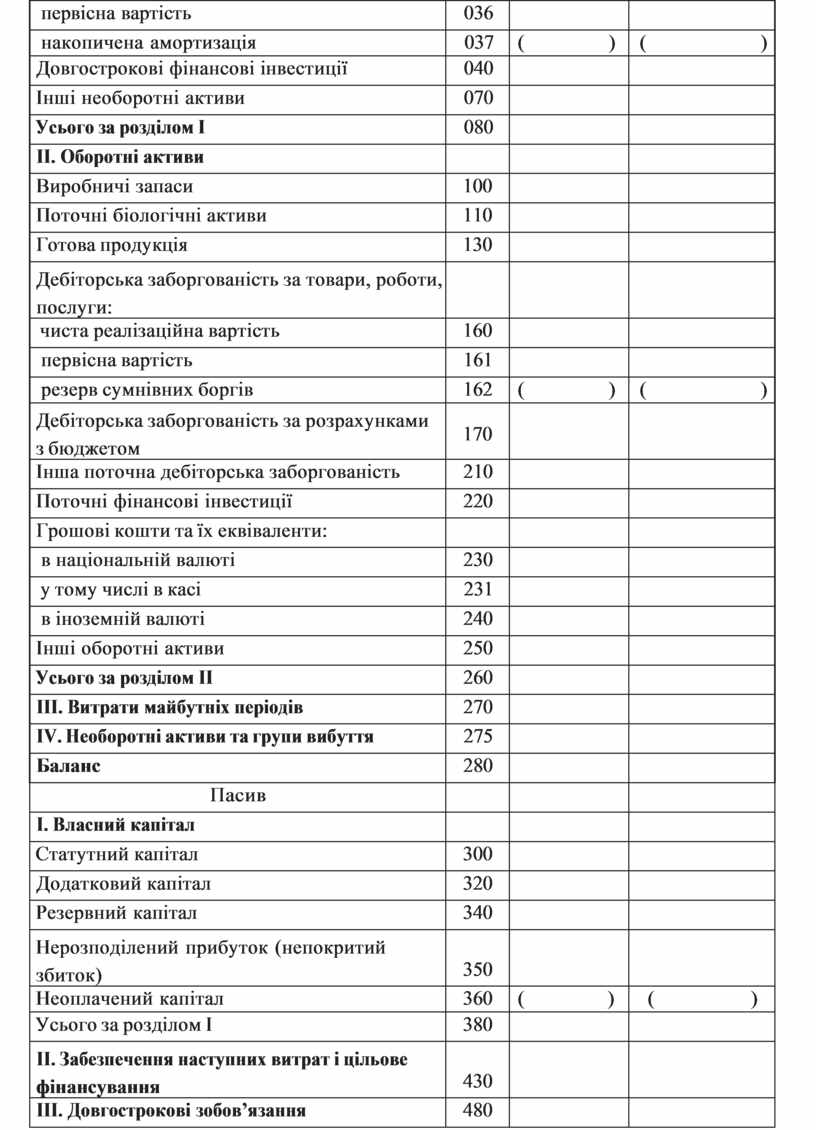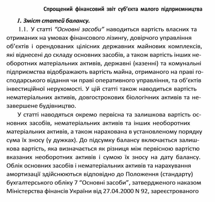 1.1. У статті “Основні засоби” наводиться вартість власних та отриманих на умовах фінансового лізингу, довірчого управління об’єктів і орендованих цілісних державних майнових комплексів, які віднесені до складу основних засобів, а також вартість інших не- оборотних матеріальних активів, державні (казенні) та комунальні підприємства відображають вартість майна, отриманого на праві го- сподарського відання чи праві оперативного управління, та об’єктів інвестиційної нерухомості. У цій статті також наводиться вартість нематеріальних активів, довгострокових біологічних активів та не- завершене будівництво.