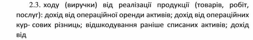2.4. У статті “Інші доходи” відображаються суми інших доходів від операційної та звичайної діяльності підприємства, крім до- ходу (виручки) від реалізації продукції (товарів, робіт, послуг): дохід від операційної оренди активів; дохід від операційних кур- сових різниць; відшкодування раніше списаних активів; дохід від