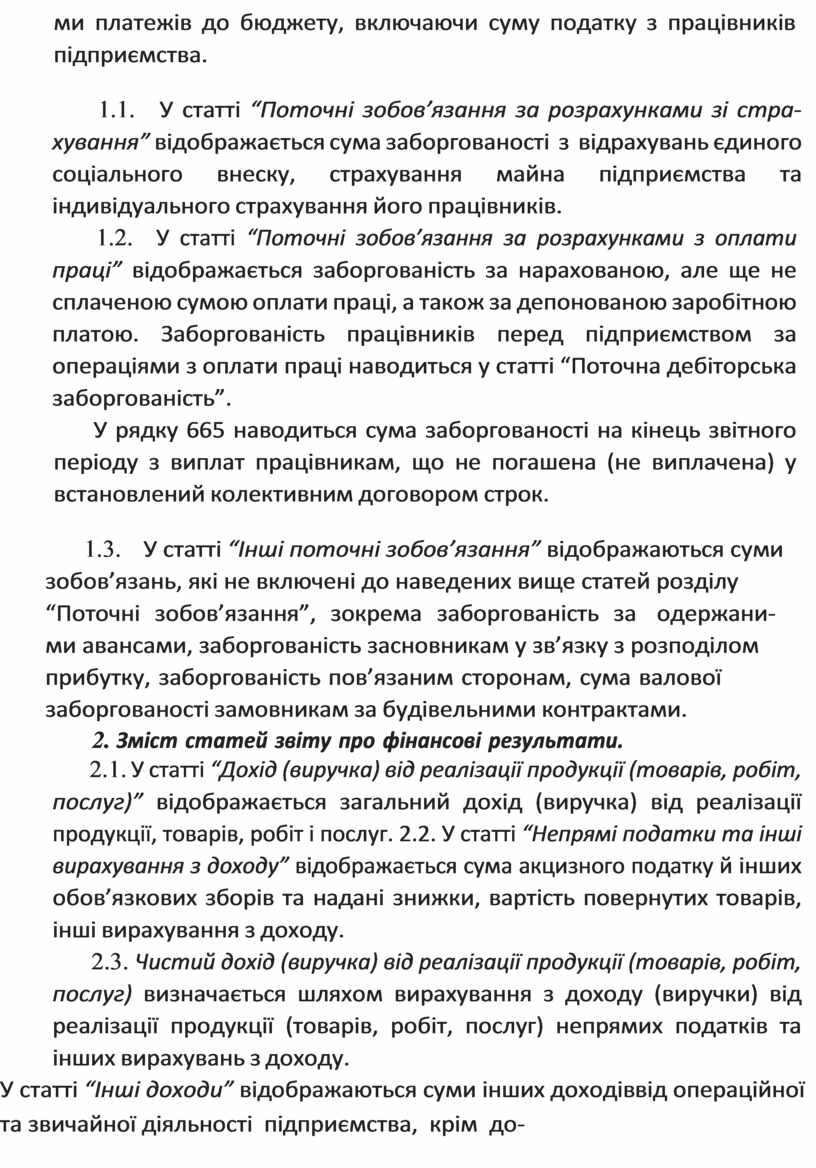 2.1. У статті “Дохід (виручка) від реалізації продукції (товарів, робіт, послуг)” відображається загальний дохід (виручка) від реалізації продукції, товарів, робіт і послуг. 2.2. У статті “Непрямі податки та інші вирахування з доходу” відображається сума акцизного податку й інших обов’язкових зборів та надані знижки, вартість повернутих товарів, інші вирахування з доходу.