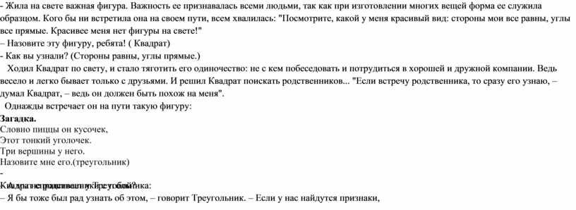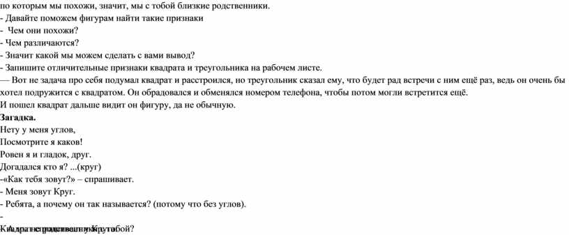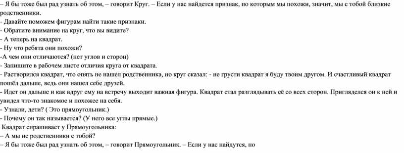 - Я расскажу вам сказку. Она необычная, математическая и называется «Родственники». - Жила на свете важная фигура. Важность ее признавалась всеми людьми, так как при изготовлении многих вещей форма ее служила образцом. Кого бы ни встретила она на своем пути, всем хвалилась: "Посмотрите, какой у меня красивый вид: стороны мои все равны, углы все прямые. Красивее меня нет фигуры на свете!" – Назовите эту фигуру, ребята! ( Квадрат) - Как вы узнали? (Стороны равны, углы прямые.) Ходил Квадрат по свету, и стало тяготить его одиночество: не с кем побеседовать и потрудиться в хорошей и дружной компании. Ведь весело и легко бывает только с друзьями. И решил Квадрат поискать родственников... "Если встречу родственника, то сразу его узнаю, – думал Квадрат, – ведь он должен быть похож на меня". Однажды встречает он на пути такую фигуру: Загадка. Словно пиццы он кусочек, - Квадрат спрашивает у Треугольника: – А мы не родственники с тобой? – Я бы тоже был рад узнать об этом, – говорит Треугольник. – Если у нас найдутся признаки, по которым мы похожи, значит, мы с тобой близкие родственники. - Давайте поможем фигурам найти такие признаки - Чем они похожи? - Чем различаются? - Значит какой мы можем сделать с вами вывод? - Запишите отличительные признаки квадрата и треугольника на рабочем листе. — Вот не задача про себя подумал квадрат и расстроился, но треугольник сказал ему, что будет рад встречи с ним ещё раз, ведь он очень бы хотел подружится с квадратом. Он обрадовался и обменялся номером телефона, чтобы потом могли встретится ещё. И пошел квадрат дальше видит он фигуру, да не обычную. Загадка. Нету у меня углов, Посмотрите я каков! Ровен я и гладок, друг. Догадался кто я? ...(круг) -«Как тебя зовут?» – спрашивает. - Меня зовут Круг. - Ребята, а почему он так называется? (потому что без углов). - Квадрат спрашивает у Круга: – А мы не родственники с тобой? – Я бы тоже был рад узнать об этом, – говорит Круг. – Если у нас найдется признак, по которым мы похожи, значит, мы с тобой близкие родственники. - Давайте поможем фигурам найти такие признаки. - Обратите внимание на круг, что вы видите? - А теперь на квадрат. - Ну что ребята они похожи? -А чем они отличаются? (нет углов и сторон) - Запишите в рабочем листе отличия круга от квадрата. - Растворился квадрат, что опять не нашел родственника, но круг сказал: - не грусти квадрат я буду твоим другом. И счастливый квадрат пошёл дальше, ведь они нашел себе друзей. - Идет он дальше и как вдруг ему на встречу выходит важная фигура. Квадрат стал разглядывать её со всех сторон. Пригляделся он к ней и увидел что-то знакомое и похожее на себя. - Узнали, дети? ( Это прямоугольник.) - Почему он так называется? (У него все углы прямые.) Квадрат спрашивает у Прямоугольника: – А мы не родственники с тобой? – Я бы тоже был рад узнать об этом, – говорит Прямоугольник. – Если у нас найдутся, по которым мы похожи, значит, мы с тобой близкие родственники. - Давайте поможем фигурам найти такие признаки - Посмотрите внимательно на прямоугольник, вглядитесь, может, вы еще что-то интересное заметите у прямоугольника? Обратите внимание на стороны прямоугольника. - А как можно назвать эти стороны, которые находятся напротив друг друга. – Почему они так называются? (Противоположны, лежат против друг друга). - А что это значит: стороны, находящиеся друг напротив друга одинаковые? (Он