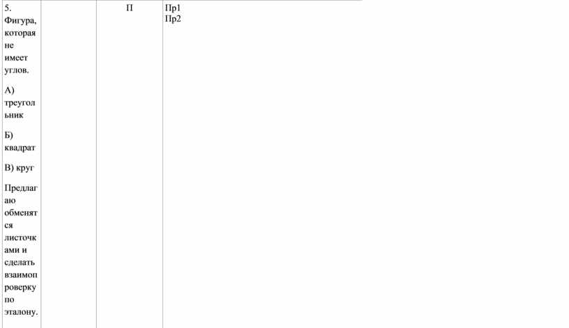 Запишите ответ________. 2.Что общего у прямоугольника и квадрата? А) все углы прямые Б) все стороны равны В) нет ничего общего 3. Допиши предложения. Прямоугольник, у которого все стороны равны, называется __________. 4. Это четырехугольник, у которого все стороны равны и углы примые. А) прямоугольник Б) треугольник В) квадрат 5. Фигура, которая не имеет углов. А) треугольник Б) квадрат В) круг Предлагаю обменятся листочками и сделать взаимопроверку по эталону. |