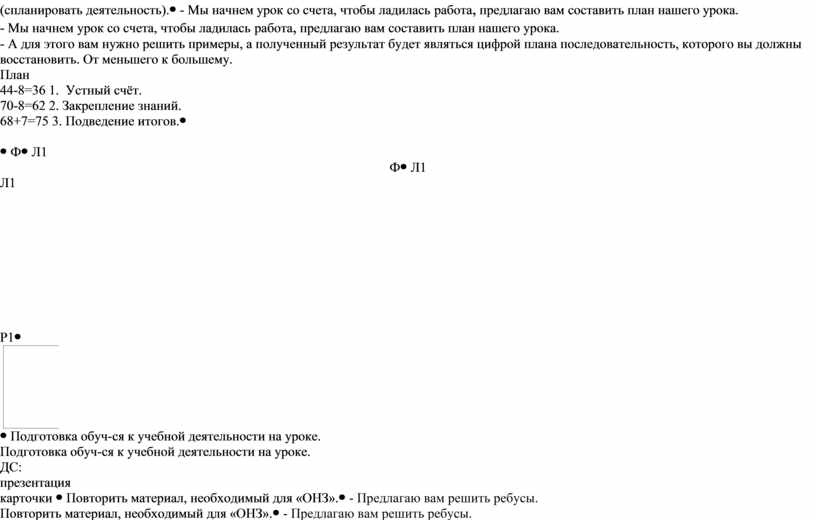 - Мы начнем урок со счета, чтобы ладилась работа, предлагаю вам составить план нашего урока. - А для этого вам нужно решить примеры, а полученный результат будет являться цифрой плана последовательность, которого вы должны восстановить. От меньшего к большему. План 44-8=36 1. Устный счёт. 70-8=62 2. Закрепление знаний. 68+7=75 3. Подведение итогов. |