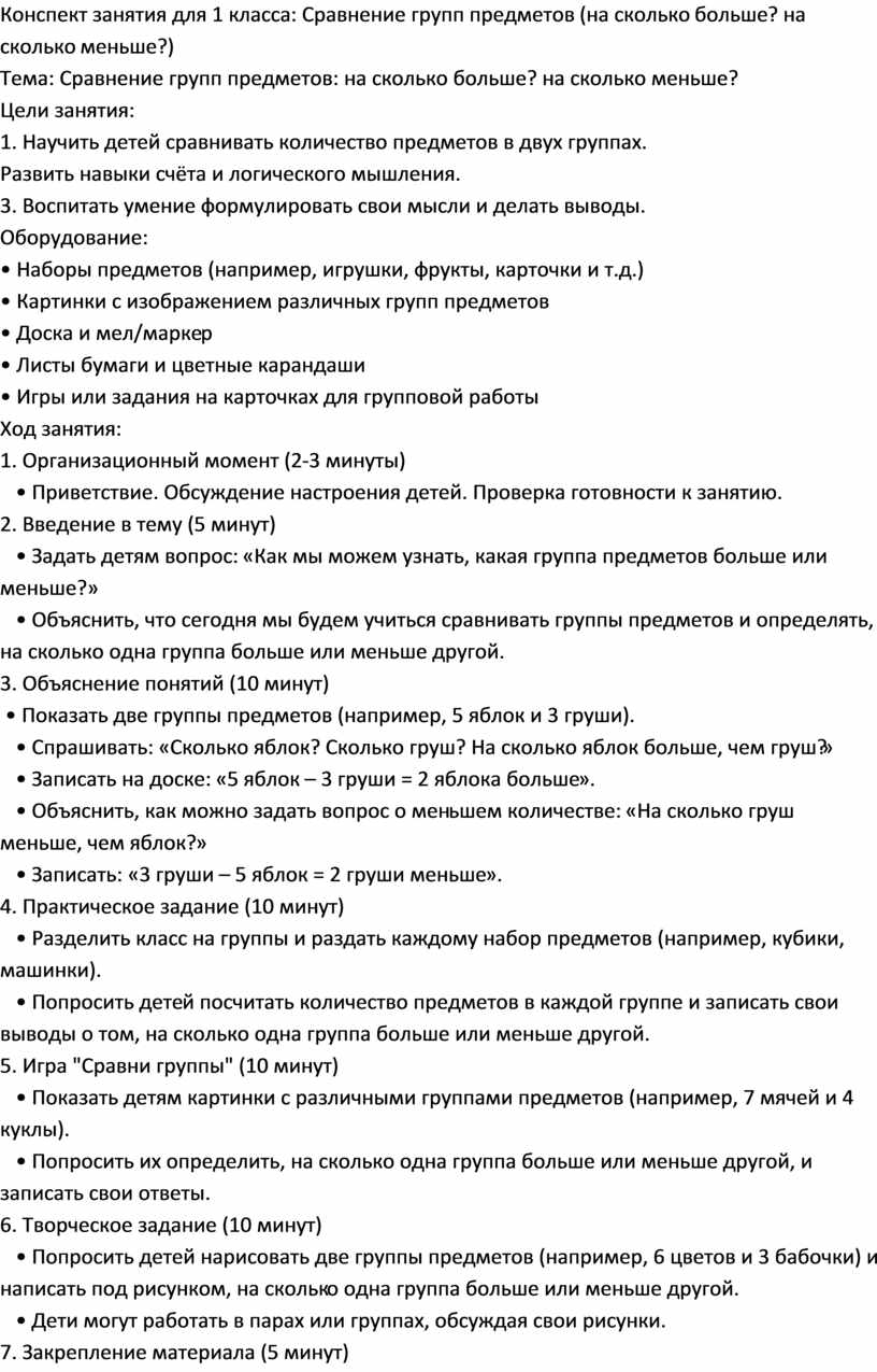 Конспект занятия для 1 класса: Сравнение групп предметов (на сколько больше? на сколько меньше?)