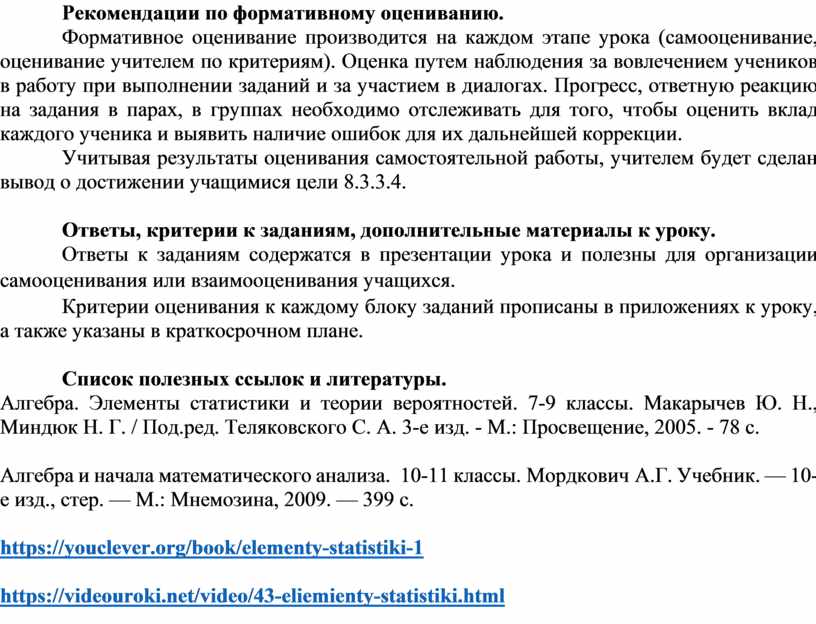 Формативное оценивание производится на каждом этапе урока (самооценивание, оценивание учителем по критериям). Оценка путем наблюдения за вовлечением учеников в работу при выполнении заданий и за участием в диалогах. Прогресс, ответную реакцию на задания в парах, в группах необходимо отслеживать для того, чтобы оценить вклад каждого ученика и выявить наличие ошибок для их дальнейшей коррекции.