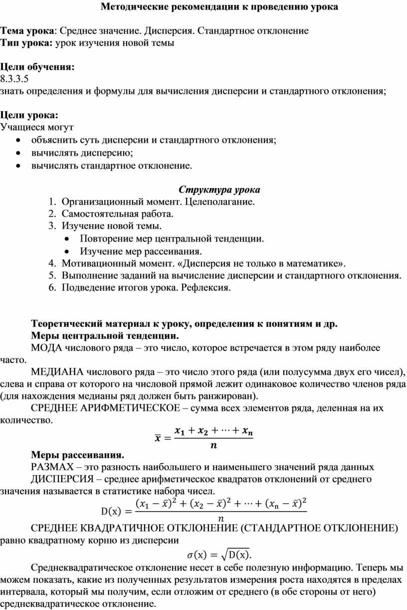 знать определения и формулы для вычисления дисперсии и стандартного отклонения;