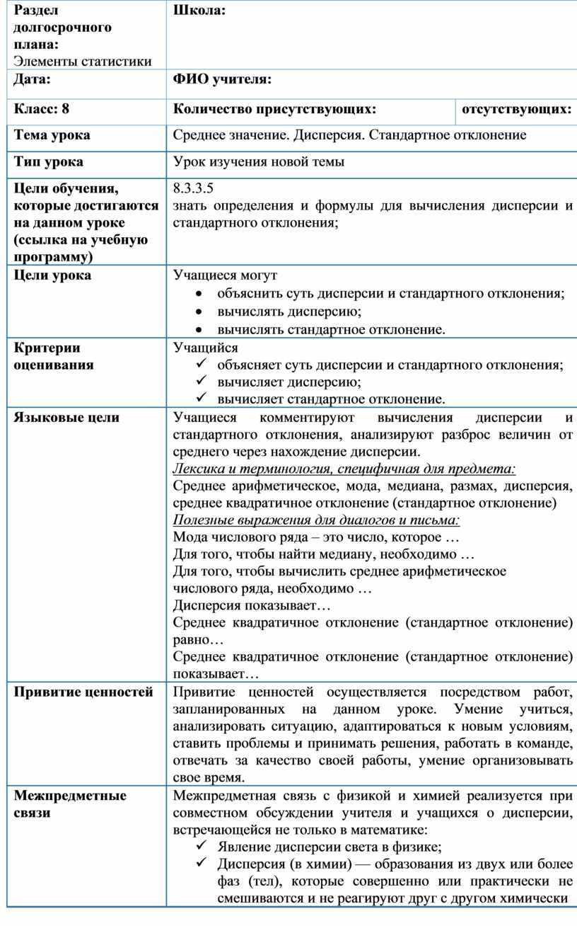 Учащиеся комментируют вычисления дисперсии и стандартного отклонения, анализируют разброс величин от среднего через нахождение дисперсии. Лексика и терминология, специфичная для предмета: Среднее арифметическое, мода, медиана, размах, дисперсия, среднее квадратичное отклонение (стандартное отклонение) Полезные выражения для диалогов и письма: Мода числового ряда – это число, которое … Для того, чтобы найти медиану, необходимо … Для того, чтобы вычислить среднее арифметическое числового ряда, необходимо … Дисперсия показывает… Среднее квадратичное отклонение (стандартное отклонение) равно… Среднее квадратичное отклонение (стандартное отклонение) показывает… |