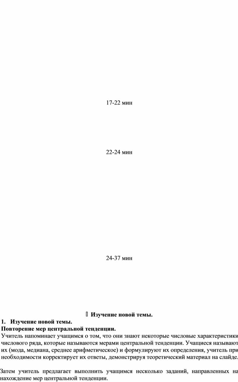 3. Изучение новой темы. Повторение мер центральной тенденции. Учитель напоминает учащимся о том, что они знают некоторые числовые характеристики числового ряда, которые называются мерами центральной тенденции. Учащиеся называют их (мода, медиана, среднее арифметическое) и формулируют их определения, учитель при необходимости корректирует их ответы, демонстрируя теоретический материал на слайде.