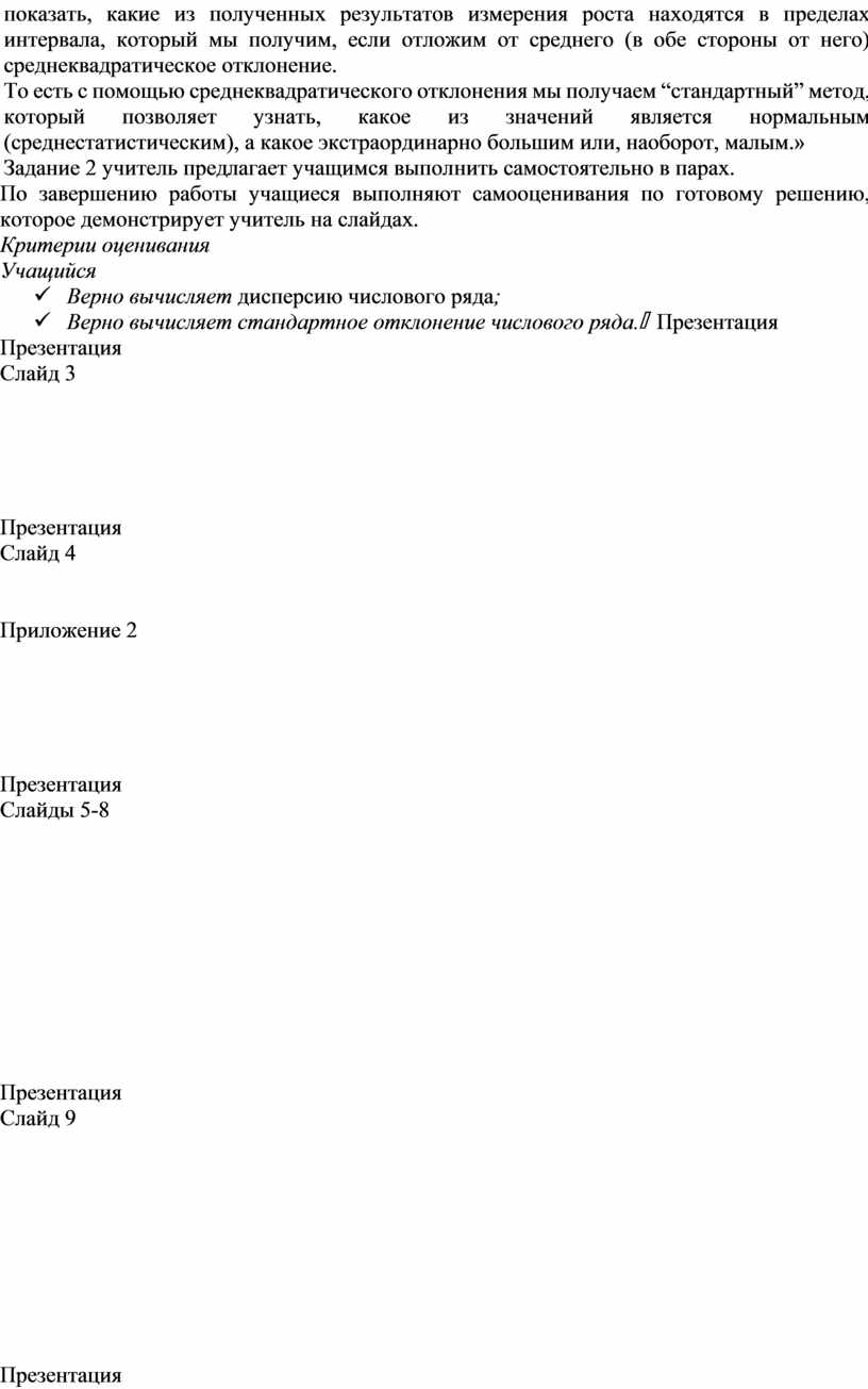 5. Выполнение заданий на вычисление дисперсии и стандартного отклонения. Задание 1 учащиеся решают совместно с учителем, при этом учитель объясняет на примере этого задания для чего необходимо стандартное отклонение. Учитель: «У дисперсии есть один существенный недостаток: если исходные значения ряда измеряются в каких-то единицах (например, в тенге), то у дисперсии эти единицы возводятся в квадрат («квадратные» тенге). Избавиться от таких странных единиц измерения можно, если использовать другую характеристику разброса — стандартное отклонение. Стандартным (или средним квадратичным) отклонением числового ряда называется квадратный корень из дисперсии. Среднеквадратическое отклонение несет в себе полезную информацию. Теперь мы можем показать, какие из полученных результатов измерения роста находятся в пределах интервала, который мы получим, если отложим от среднего (в обе стороны от него) среднеквадратическое отклонение. То есть с помощью среднеквадратического отклонения мы получаем “стандартный” метод, который позволяет узнать, какое из значений является нормальным (среднестатистическим), а какое экстраординарно большим или, наоборот, малым.» Задание 2 учитель предлагает учащимся выполнить самостоятельно в парах. По завершению работы учащиеся выполняют самооценивания по готовому решению, которое демонстрирует учитель на слайдах. Критерии оценивания Учащийся ü Верно вычисляет дисперсию числового ряда; ü Верно вычисляет стандартное отклонение числового ряда. |