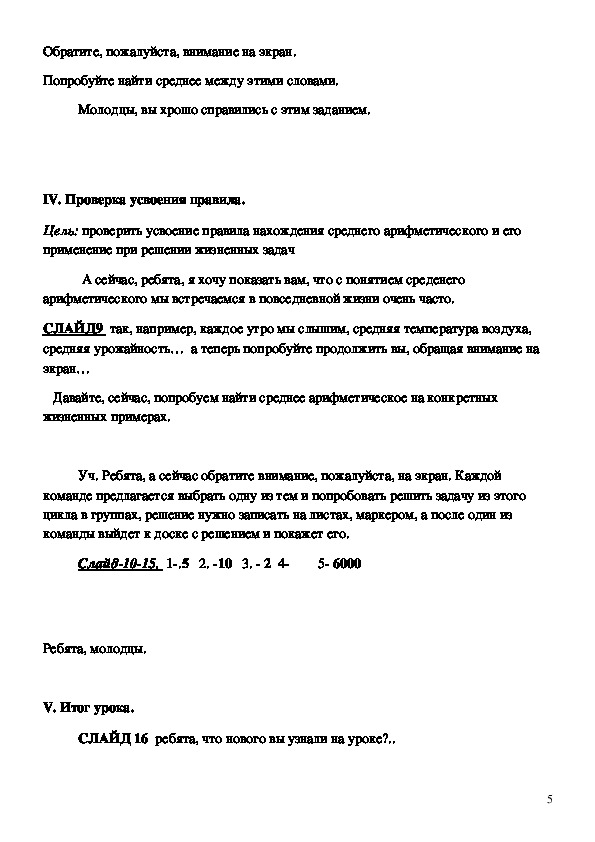Цель: проверить усвоение правила нахождения среднего арифметического и его
