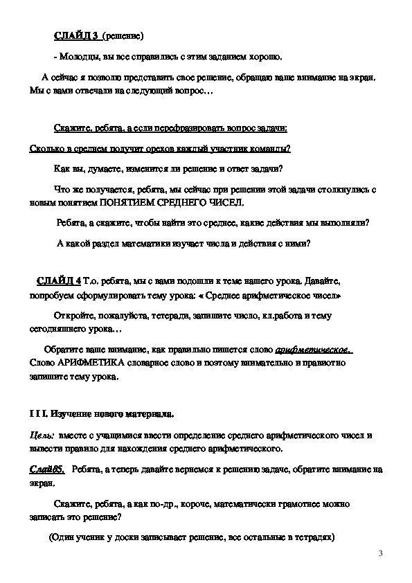 Цель: вместе с учащимися ввести определение среднего арифметического чисел и