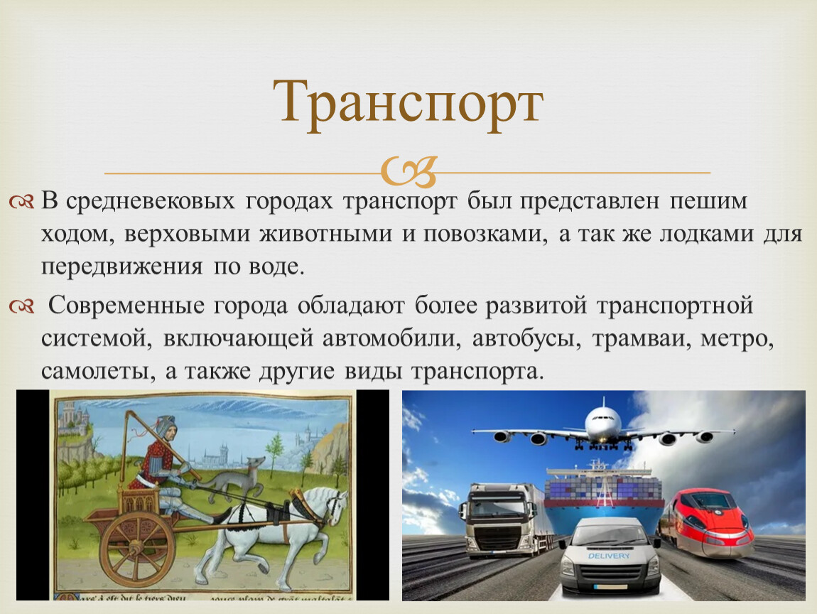 Современные города обладают более развитой транспортной системой, включающей автомобили, автобусы, трамваи, метро, самолеты, а также другие виды транспорта.