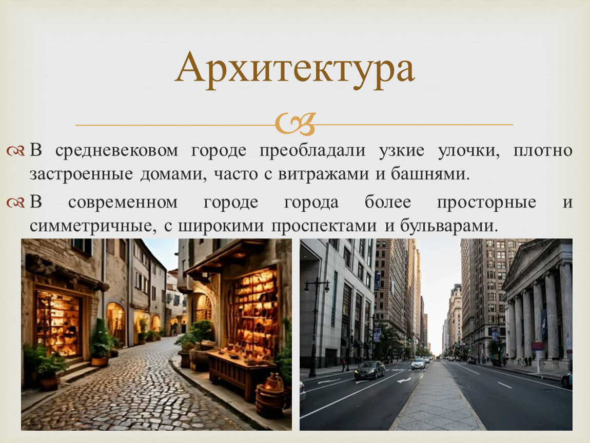 В современном городе города более просторные и симметричные, с широкими проспектами и бульварами.