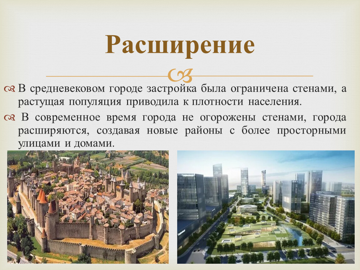 В современное время города не огорожены стенами, города расширяются, создавая новые районы с более просторными улицами и домами.