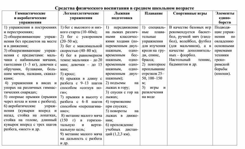 1) бег с высокого и низ- кого старта (10–60м); 2) бег с ускорением (20–50 м); 3) бег с максимальной скоростью (40–80 м); 4) бег в равномерном темпе: мальчики – до 20 мин; девочки – до 15 мин; 5) кросс; 6) прыжки в длину с разбега с 9–13 шагов способом «согнув но- ги»; 7) прыжки в высоту с разбега с 6–8 шагов способом «перешагива- ние»; 8) метание малого мяча (150 г) в горизон- тальную и верти- кальную цель; 9) метание малого мяча на дальность с разбега и др. |