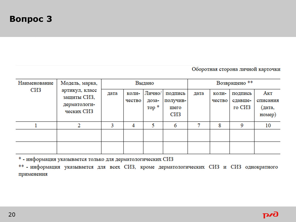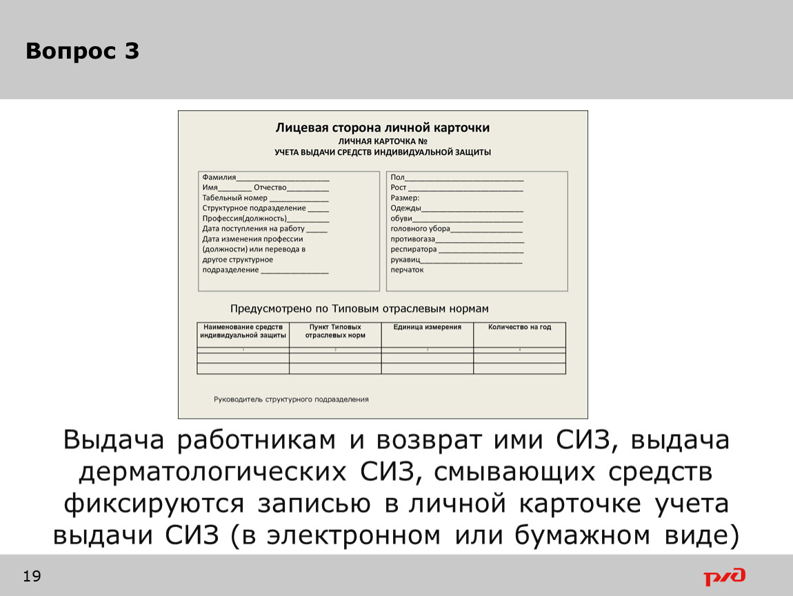 Выдача работникам и возврат ими СИЗ, выдача дерматологических СИЗ, смывающих средств фиксируются записью в личной карточке учета выдачи СИЗ (в электронном или бумажном виде)