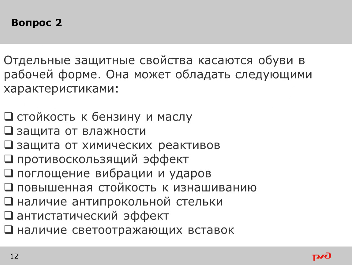 Отдельные защитные свойства касаются обуви в рабочей форме. Она может обладать следующими характеристиками: