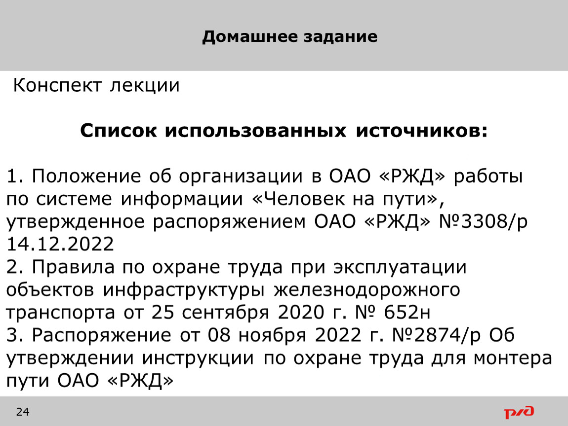 3. Распоряжение от 08 ноября 2022 г. №2874/р Об утверждении инструкции по охране труда для монтера пути ОАО «РЖД»
