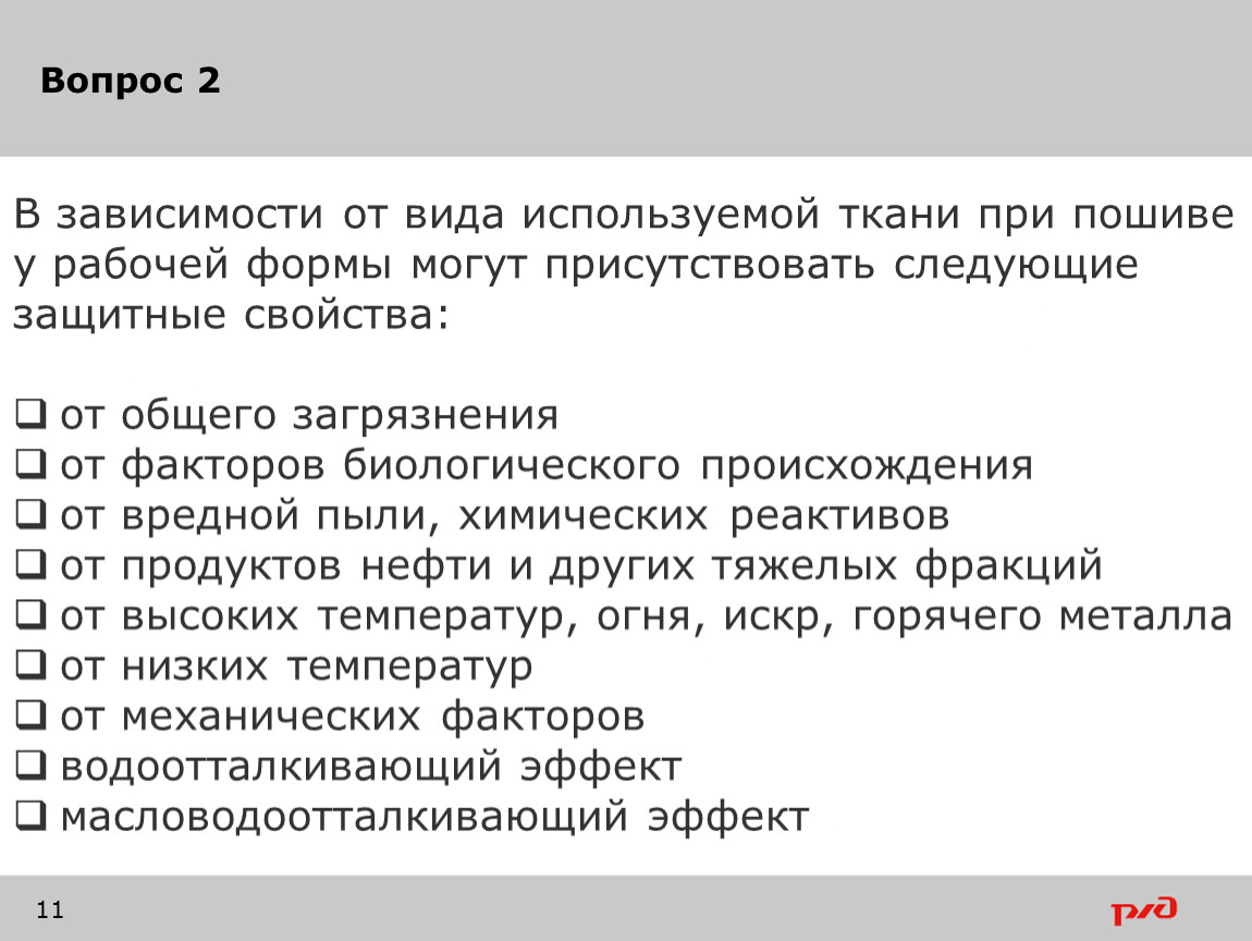 В зависимости от вида используемой ткани при пошиве у рабочей формы могут присутствовать следующие защитные свойства: