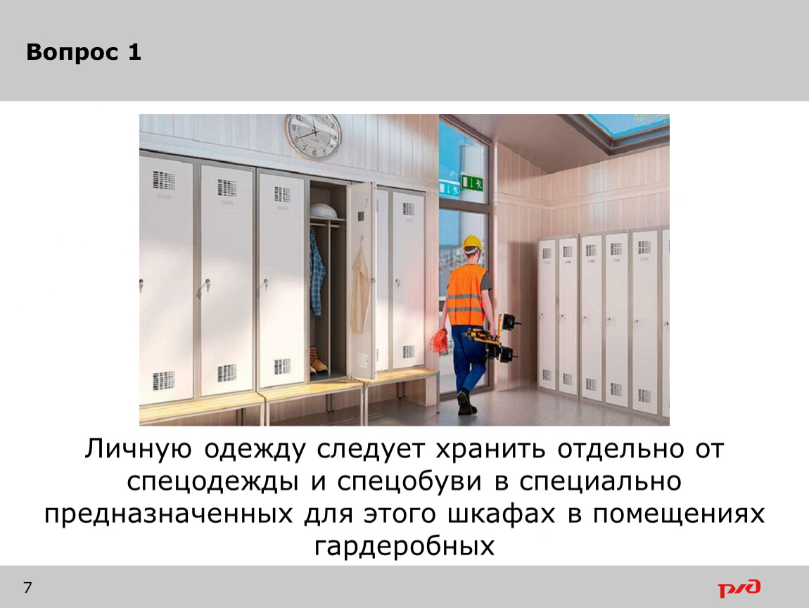 Личную одежду следует хранить отдельно от спецодежды и спецобуви в специально предназначенных для этого шкафах в помещениях гардеробных