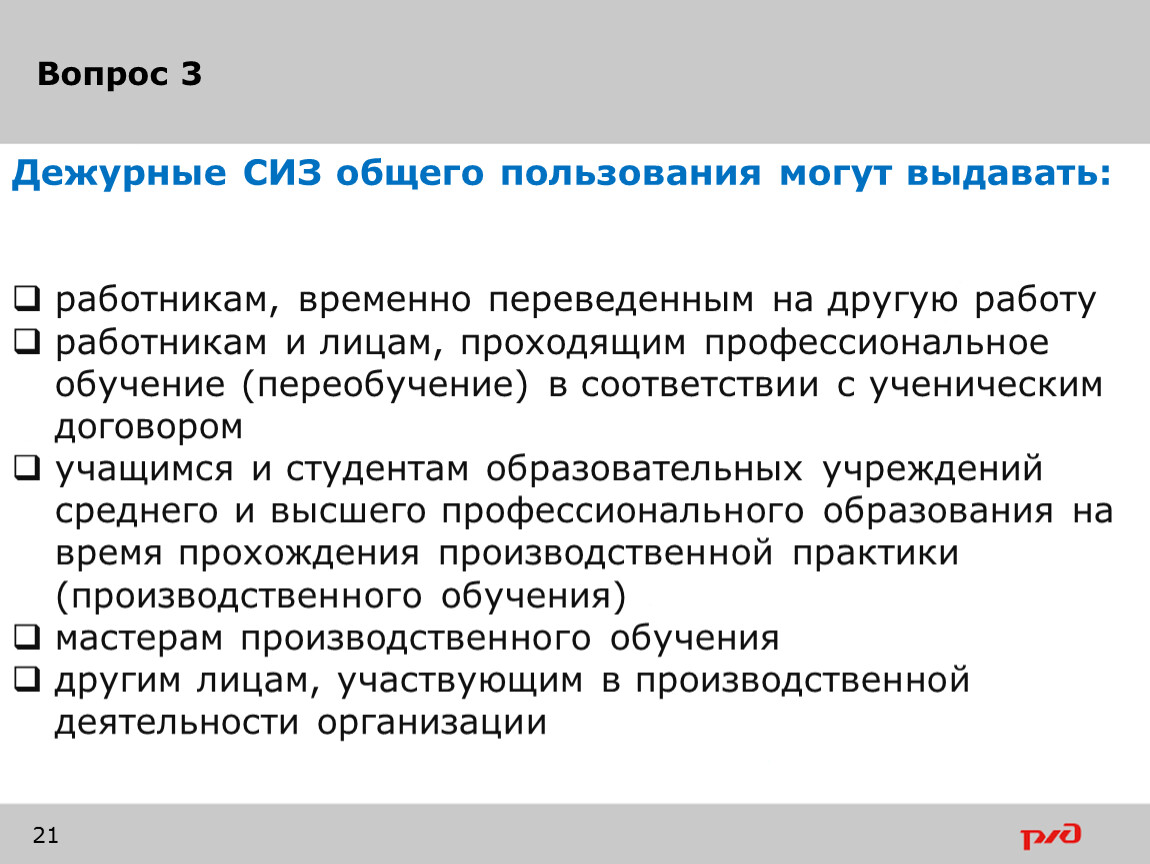 Дежурные СИЗ общего пользования могут выдавать:
