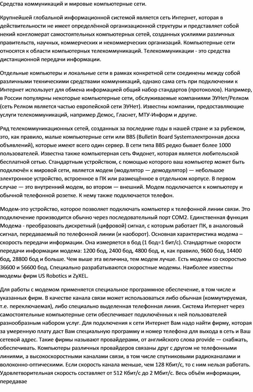 Для работы с модемом применяется специальное программное обеспечение, в том числе и указанных фирм. В качестве канала связи может использоваться либо обычная (коммутируемая, т.е. переключаемая), либо специально выделенная телефонная линия. Система Интернет через самостоятельные компьютерные сети обеспечивает подключённых к ней пользователей разнообразным набором услуг. Для подключения к сети Интернет Вам надо найти фирму, которая за умеренную плату даст Вам специальную программу и номер телефона для выхода в сеть и Ваш сетевой адрес. Такие фирмы называют провайдерами, от английского слова provide — снабжать, обеспечивать. Компьютеры различных провайдеров связаны друг с другом не телефонными линиями, а высокоскоростными каналами связи, в том числе спутниковыми радиоканалами и волоконно-оптическими. Если скорость канала меньше, чем 128 Кбит/с, то с ним нельзя работать. Удовлетворительная скорость составляет от 512 Кбит/с до 2 Мбит/с. Весь объём информации, передавае