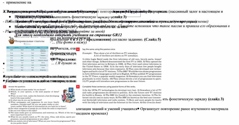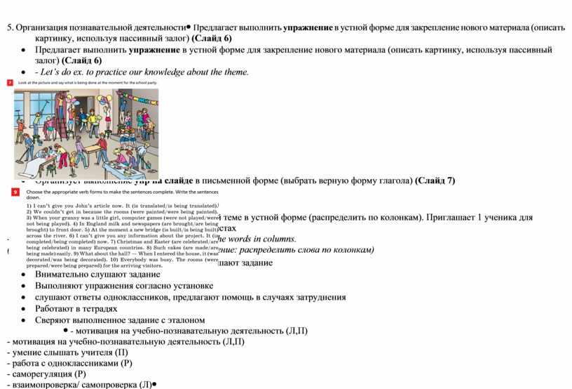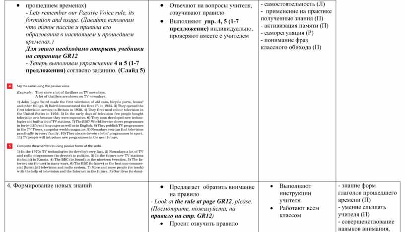 · Предлагает обратить внимание на правило - Look at the rule at page GR12, please. (Посмотрите, пожалуйста, на правило на стр. GR12) · Просит озвучить правило · Рассказывает о правилах образования Present Progressive Passive и Past Progressive Passive (правило)