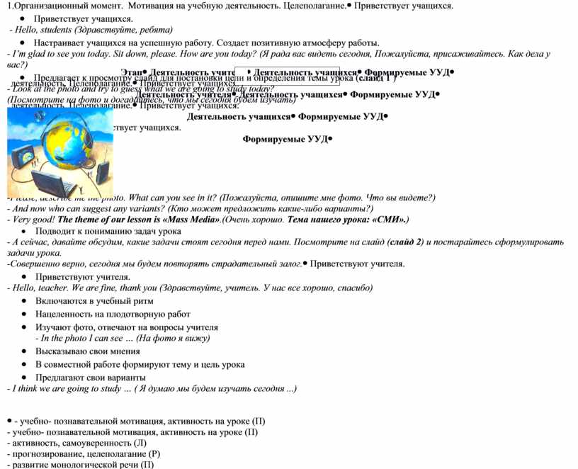 · Приветствуют учителя. - Hello, teacher. We are fine, thank you (Здравствуйте, учитель. У нас все хорошо, спасибо) · Включаются в учебный ритм · Нацеленность на плодотворную работ · Изучают фото, отвечают на вопросы учителя - In the photo I can see … (На фото я вижу) · Высказываю свои мнения · В совместной работе формируют тему и цель урока