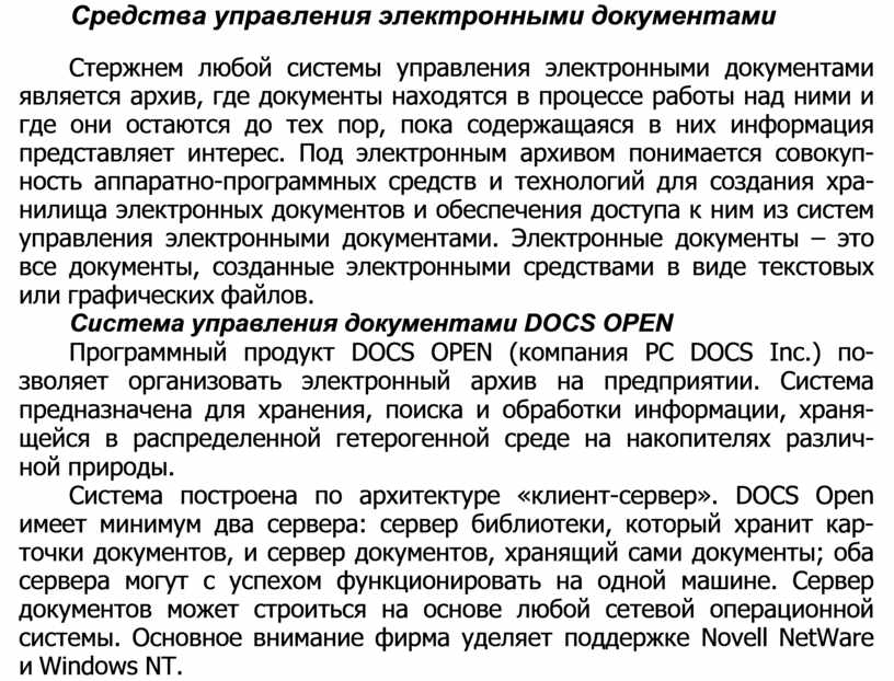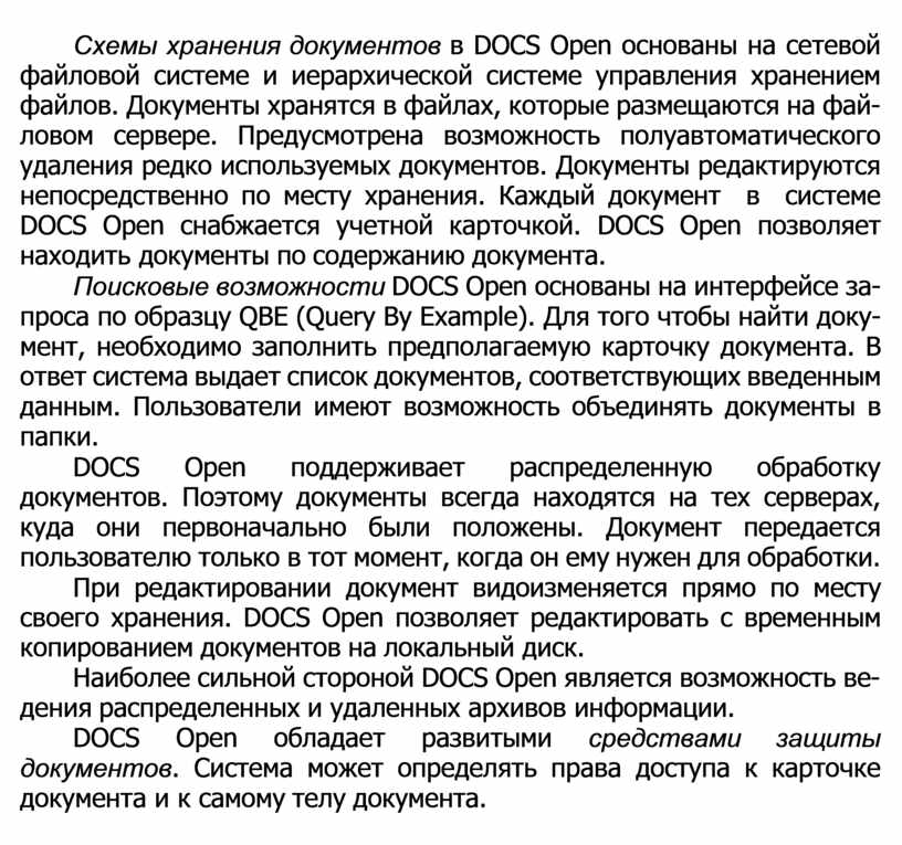 Программный продукт DOCS OPEN (компания PC DOCS Inc.) по- зволяет организовать электронный архив на предприятии. Система предназначена для хранения, поиска и обработки информации, храня- щейся в распределенной гетерогенной среде на накопителях различ- ной природы.