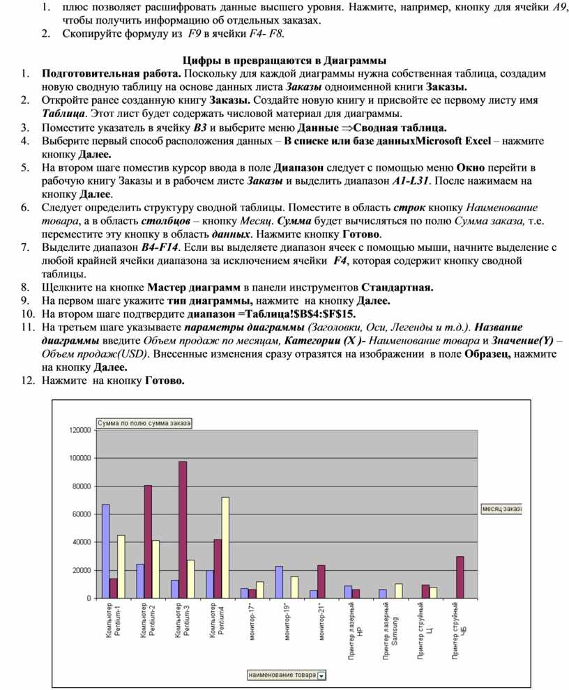 24. При консолидации данных программа записывает в итоговой таблице каждый элемент и автоматически создает структуру документа, что позволяет добиться представления на экране только необходимой информации и скрыть ненужные детали. Слева от таблицы отображаются символы структуры. Цифрами обозначаются уровни структуры (в нашем примере – 1 и 2). Кнопка со знаком плюс позволяет расшифровать данные высшего уровня. Нажмите, например, кнопку для ячейки А9, чтобы получить информацию об отдельных заказах.