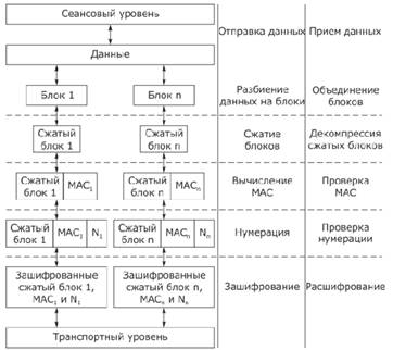 Передаваемая отправителем информация разбивается на блоки размером не более 2^14 + 2048 байт каждый. Затем каждый блок сжимается при помощи выбранного алгоритма сжатия. После этого вычисляется MAC каждого блока и прикрепляется к последнему. Полученные фрагменты последовательно нумеруются для предотвращения атак, зашифровываются при помощи выбранного алгоритма и передаются на транспортный уровень. Получатель расшифровывает полученные фрагменты, проверяет последовательность следования их номеров и целостность сообщений. Затем фрагменты распаковываются и объединяются в единое сообщение.