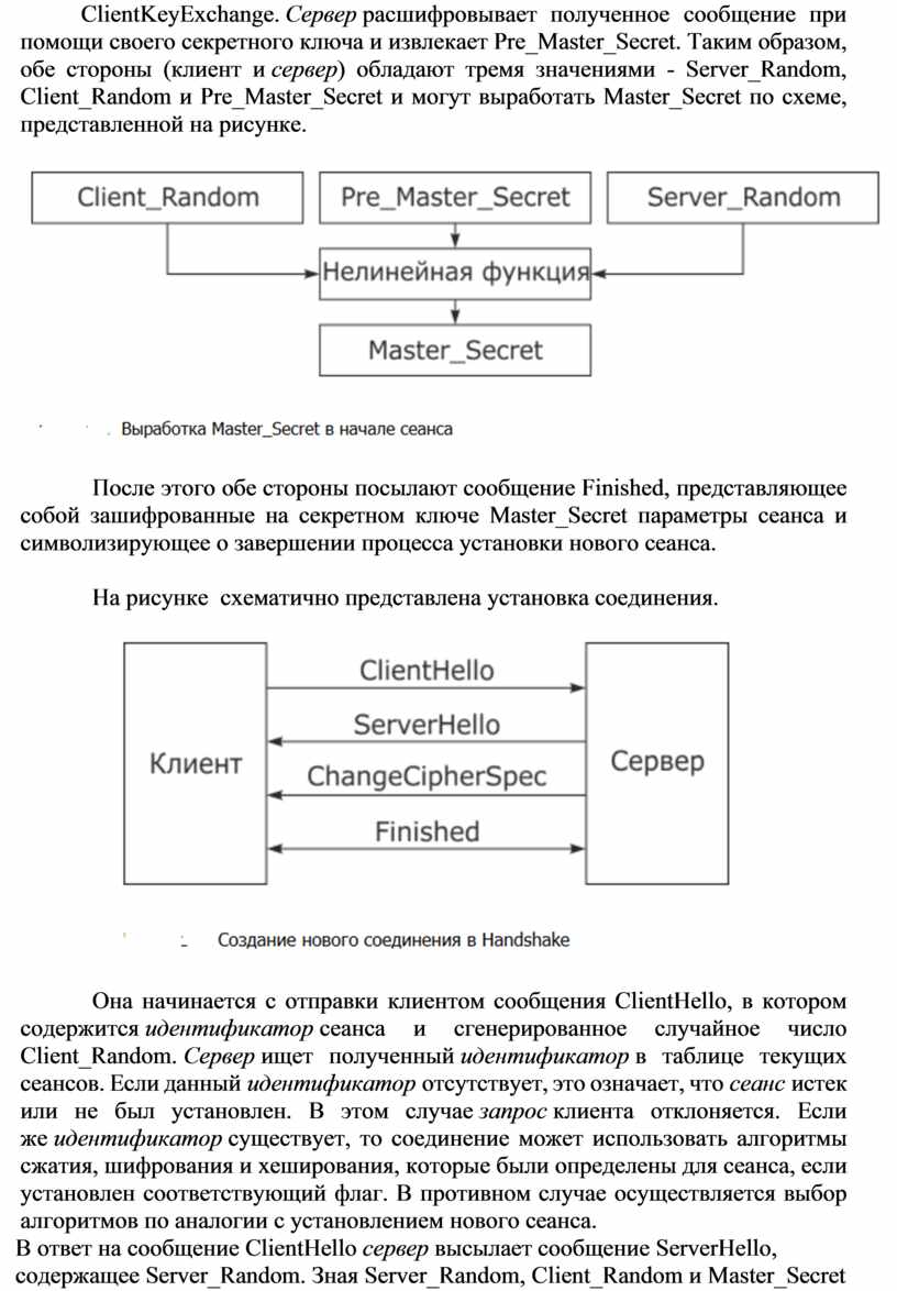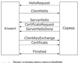 Установка сеанса, схематично представленная на рисунке3, как правило, инициализируется клиентом при помощи сообщения ClientHello (иногда инициатором выступает сервер, посылая сообщение HelloRequest, символизирующее о том, что сервер готов к процедуре Handshake), в котором клиент передает следующие параметры: