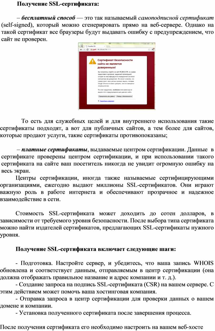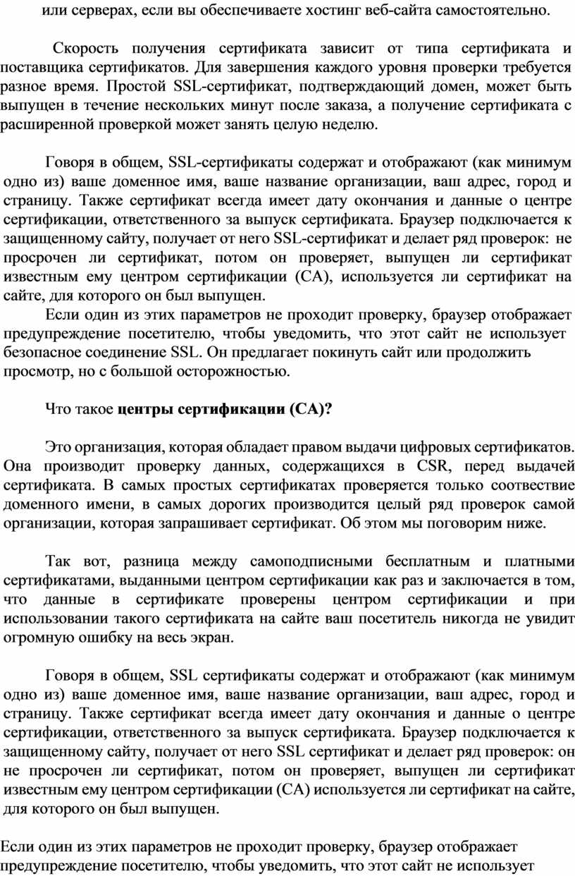 SSL-сертификат позволяет использовать https-протокол. Это безопасное соединение, которое гарантирует, что информация, которая передается от вашего браузера на сервер, остается приватной, т. е. защищенной от хакеров или любого, кто хочет украсть информацию. Один из самых распространенных примеров использования SSL — это защита клиента во время он- лайн-транзакции (покупки товара, оплаты).