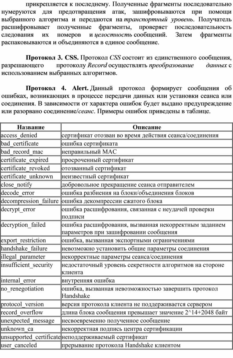 Протокол 4. Alert. Данный протокол формирует сообщения об ошибках, возникающих в процессе передачи данных или установки сеанса или соединения. В зависимости от характера ошибок будет выдано предупреждение или разорвано соединение/сеанс. Примеры ошибок приведены в таблице.