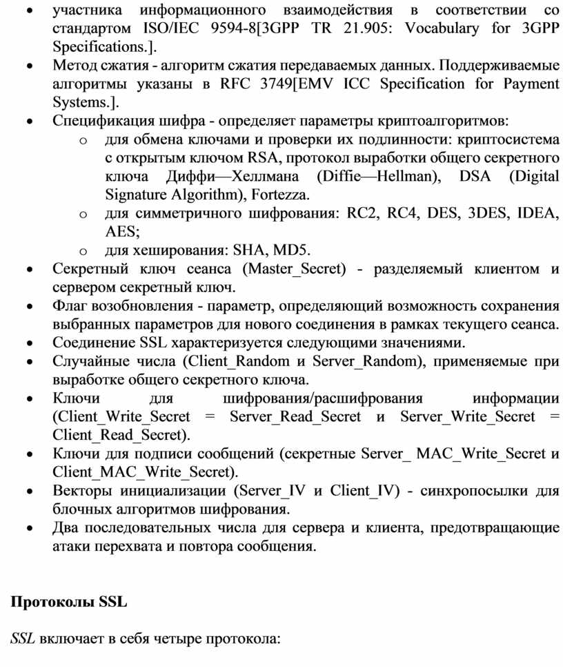 · список алгоритмов сжатия, шифрования и хеширования информации, которые будут использоваться при реализации сеанса или соединений.