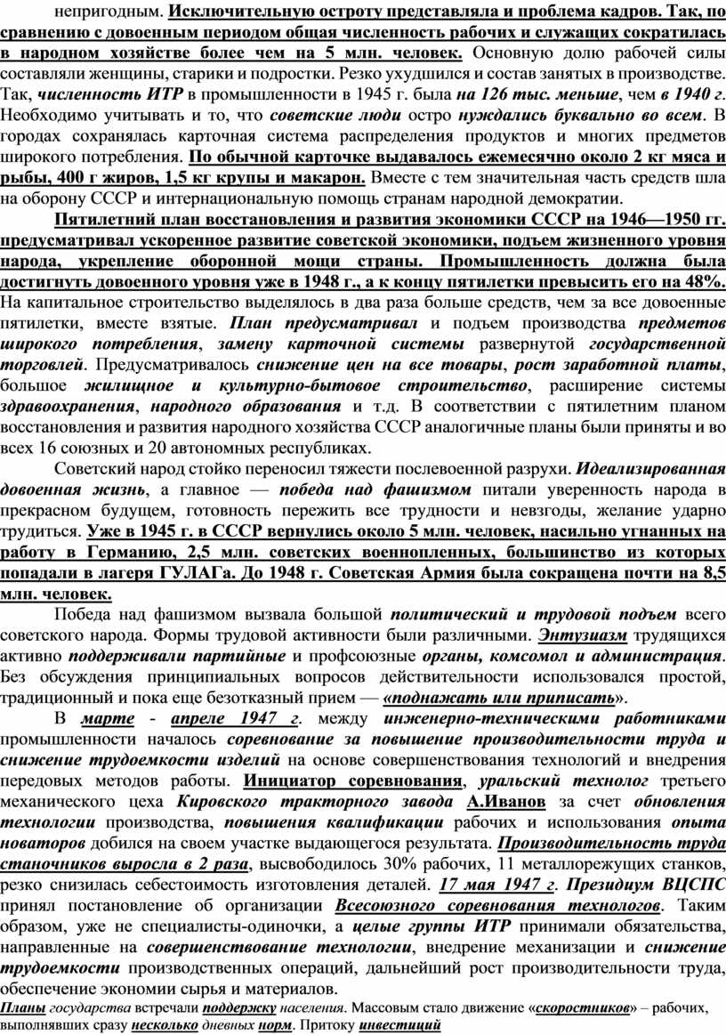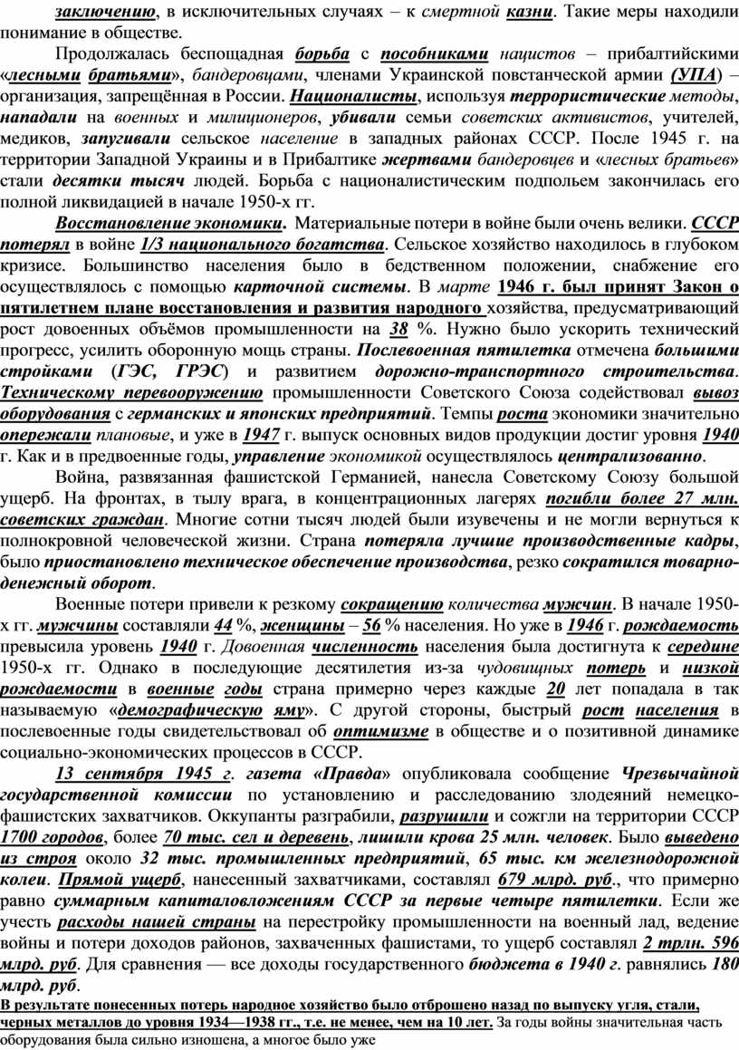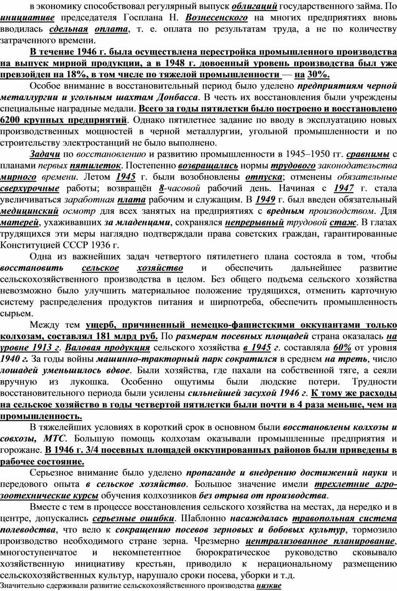Восстановление экономики. Материальные потери в войне были очень велики. СССР потерял в войне 1/3 национального богатства. Сельское хозяйство находилось в глубоком кризисе. Большинство населения было в бедственном положении, снабжение его осуществлялось с помощью карточной системы. В марте 1946 г. был принят Закон о пятилетнем плане восстановления и развития народного хозяйства, предусматривающий рост довоенных объёмов промышленности на 38 %. Нужно было ускорить технический прогресс, усилить оборонную мощь страны. Послевоенная пятилетка отмечена большими стройками (ГЭС, ГРЭС) и развитием дорожно-транспортного строительства. Техническому перевооружению промышленности Советского Союза содействовал вывоз оборудования с германских и японских предприятий. Темпы роста экономики значительно опережали плановые, и уже в 1947 г. выпуск основных видов продукции достиг уровня 1940 г. Как и в предвоенные годы, управление экономикой осуществлялось централизованно.