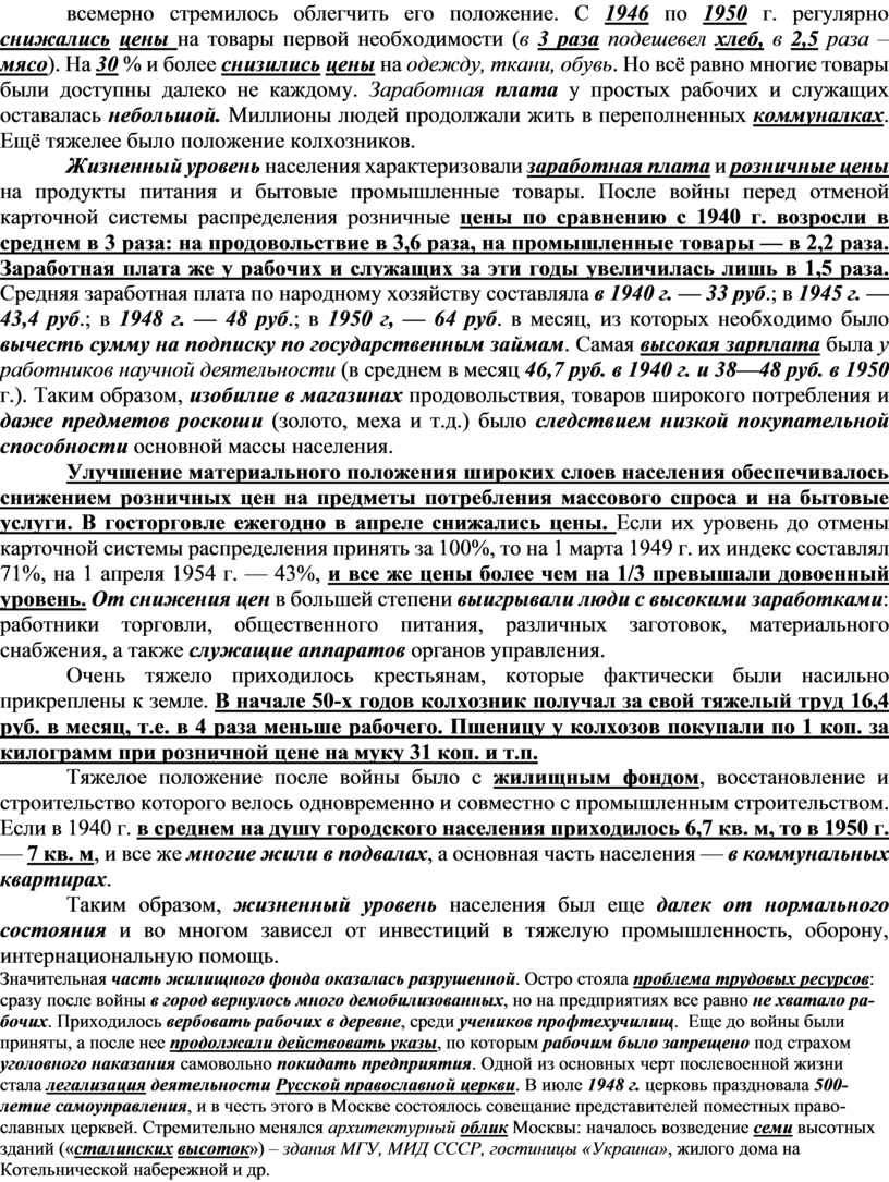Война крайне негативно сказалась на уровне жизни населения, и правительство всемерно стремилось облегчить его положение. С 1946 по 1950 г. регулярно снижались цены на товары первой необходимости (в 3 раза подешевел хлеб, в 2,5 раза – мясо). На 30 % и более снизились цены на одежду, ткани, обувь. Но всё равно многие товары были доступны далеко не каждому. Заработная плата у простых рабочих и служащих оставалась небольшой. Миллионы людей продолжали жить в переполненных коммуналках. Ещё тяжелее было положение колхозников.