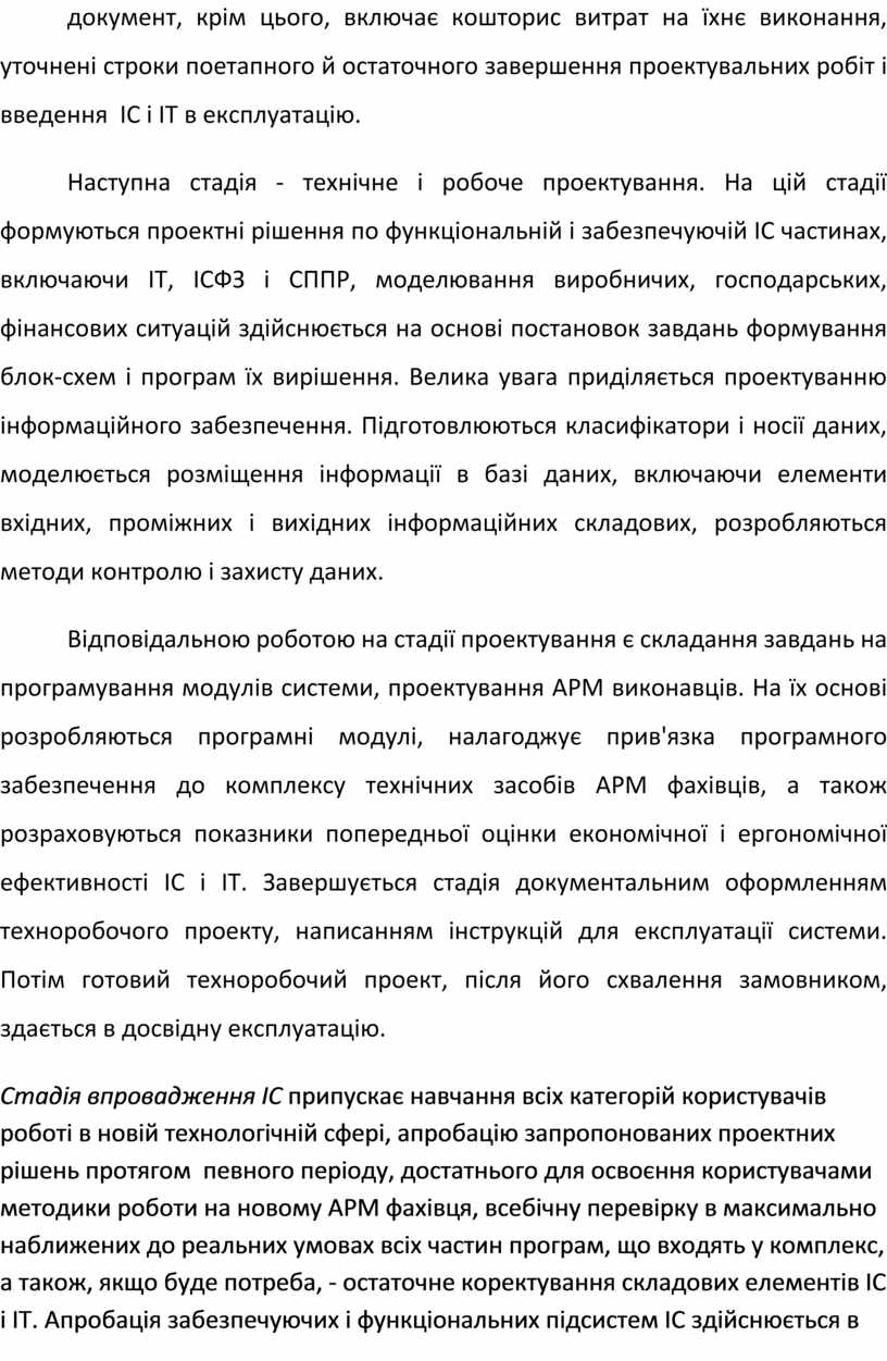 Відповідальною роботою на стадії проектування є складання завдань на програмування модулів системи, проектування АРМ виконавців. На їх основі розробляються програмні модулі, налагоджує прив'язка програмного забезпечення до комплексу технічних засобів АРМ фахівців, а також розраховуються показники попередньої оцінки економічної і ергономічної ефективності ІС і ІТ. Завершується стадія документальним оформленням техноробочого проекту, написанням інструкцій для експлуатації системи. Потім готовий техноробочий проект, після його схвалення замовником, здається в досвідну експлуатацію.