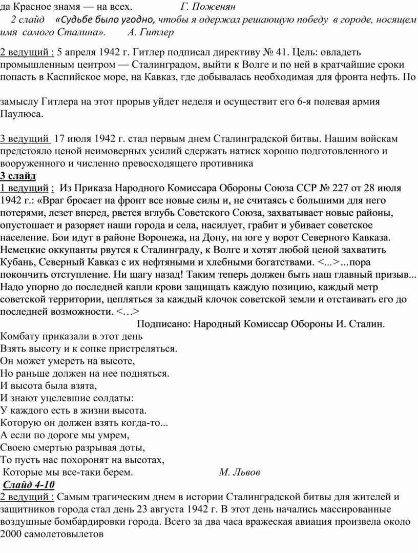 1 ведущий : Из Приказа Народного Комиссара Обороны Союза ССР № 227 от 28 июля 1942 г.: «Враг бросает на фронт все новые силы и, не считаясь с большими для него потерями, лезет вперед, рвется вглубь Советского Союза, захватывает новые районы, опустошает и разоряет наши города и села, насилует, грабит и убивает советское население. Бои идут в районе Воронежа, на Дону, на юге у ворот Северного Кавказа. Немецкие оккупанты рвутся к Сталинграду, к Волге и хотят любой ценой захватить Кубань, Северный Кавказ с их нефтяными и хлебными богатствами. <...>…пора покончить отступление. Ни шагу назад! Таким теперь должен быть наш главный призыв... Надо упорно до последней капли крови защищать каждую позицию, каждый метр советской территории, цепляться за каждый клочок советской земли и отстаивать его до последней возможности. <…>