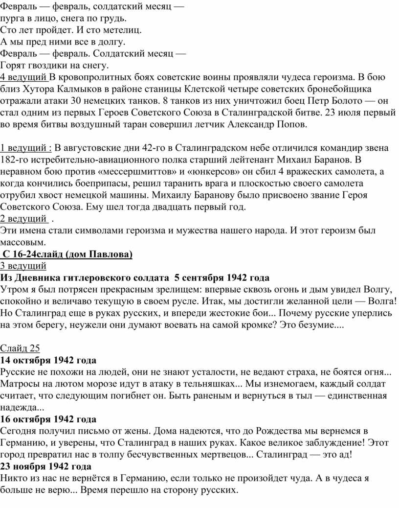 1 ведущий : Из телеграммы, направленной Паулюсом в Берлин 24 января 1943 года: «Крепость может быть удержана только считанные дни. Из-за отсутствия снабжения люди обессилели, оружие лишено подвижности. Последний аэродром в ближайшее время будет потерян, в результате чего возможность снабжения будет сведена к минимуму... Оснований для выполнения боевой задачи и удержания Сталинграда больше нет... Я намерен, не дожидаясь окончательного крушения обороны, отдать всем частям приказ организованно пробиваться на юго-запад... Если же мы останемся на месте, то, несомненно, все погибнем, пленные тоже умрут от голода и холода».