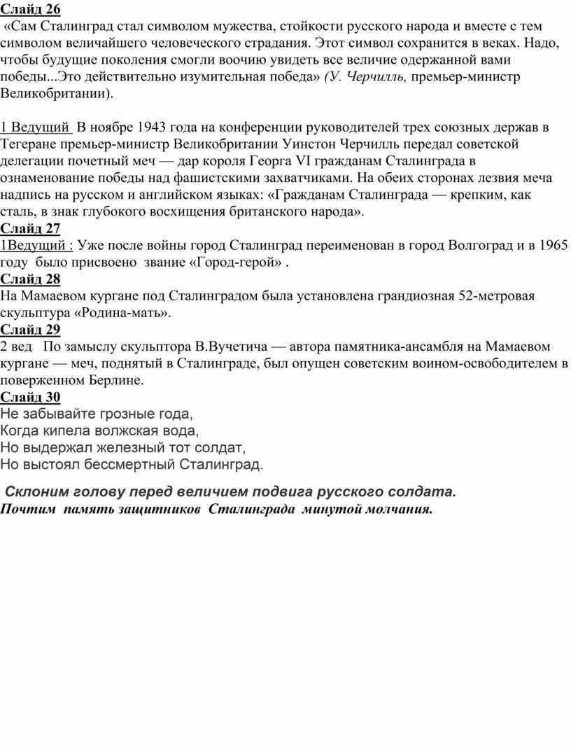 Склоним голову перед величием подвига русского солдата. Почтим память защитников Сталинграда минутой молчания.