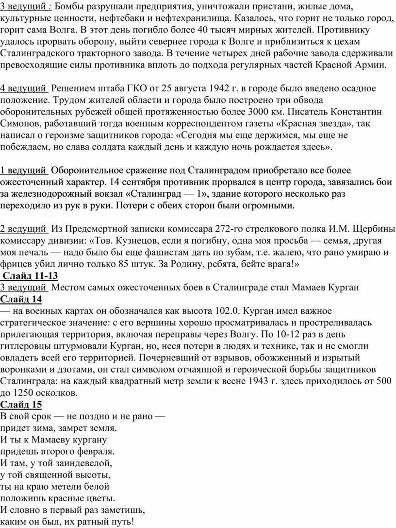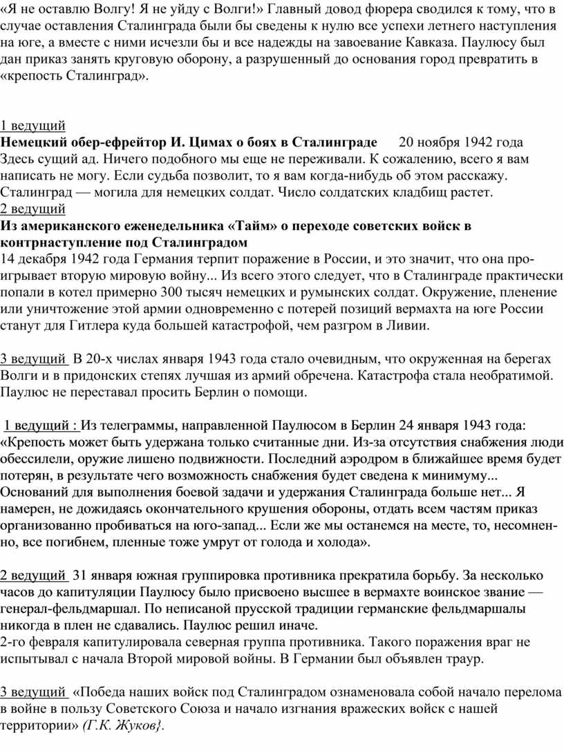 3 ведущий «Победа наших войск под Сталинградом ознаменовала собой начало перелома в войне в пользу Советского Союза и начало изгнания вражеских войск с нашей территории» (Г.К. Жуков}.